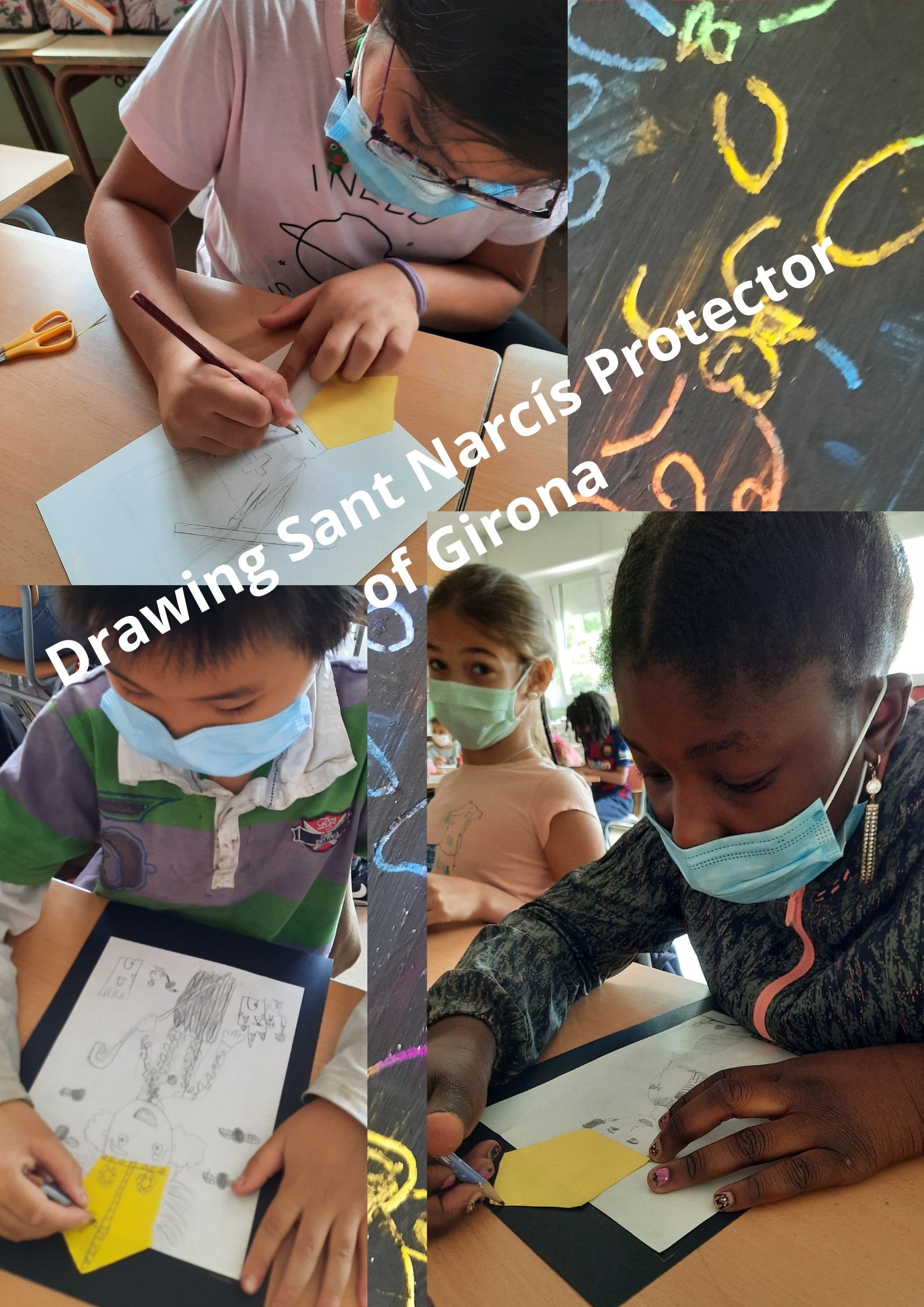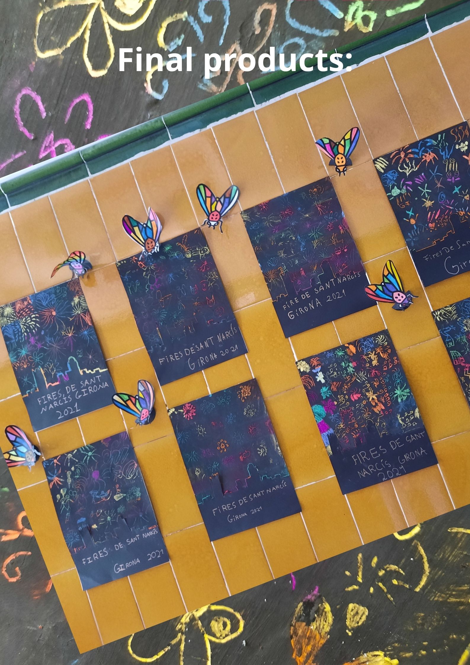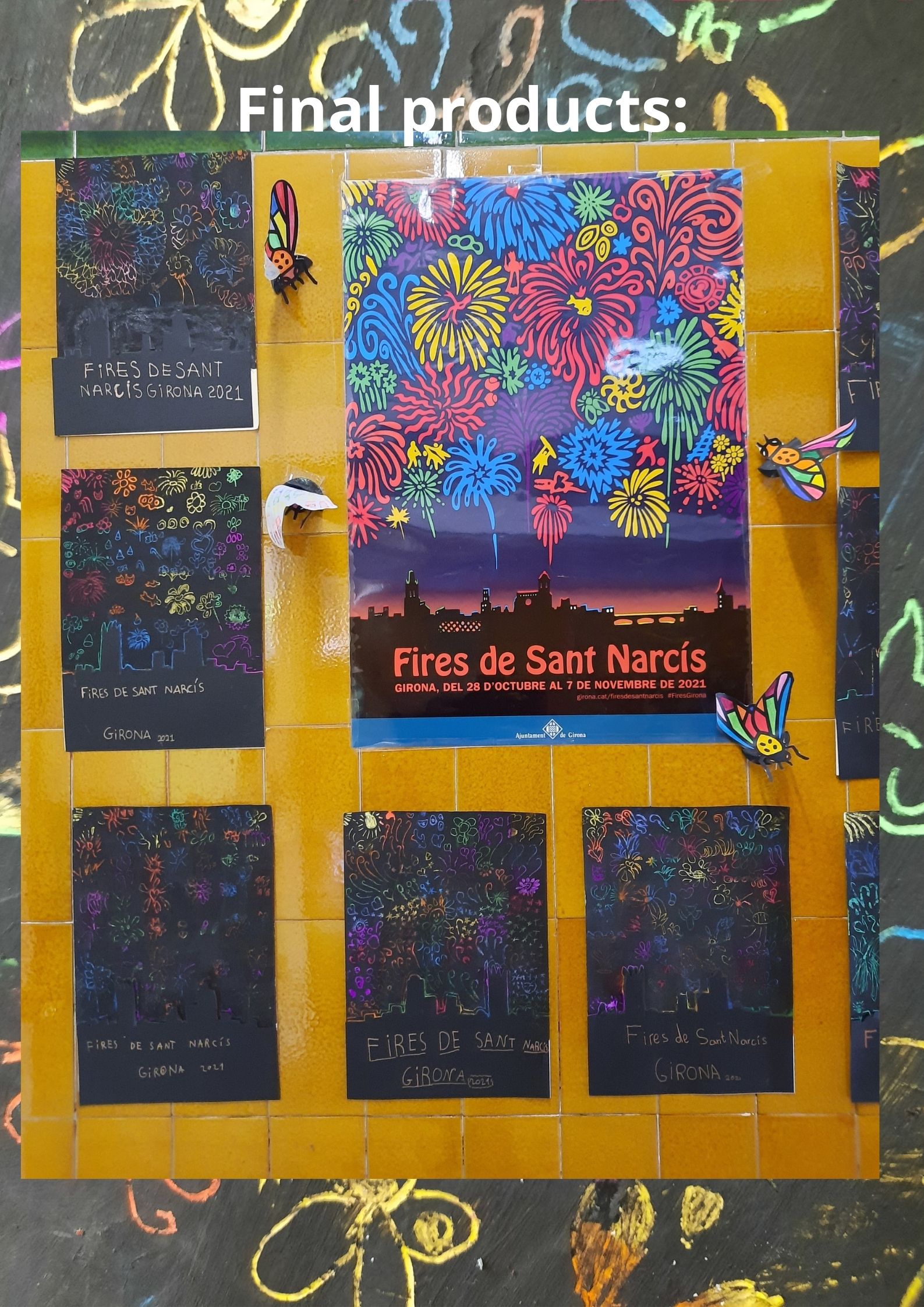 • Cartell de Fires de Sant Narcís  (FAIR POSTER) using wax, opac black paint, toothpicks, black cardboard for Girona’s skyline, scissors and glue. We draw lots of things and we discovered in the picture hidden drawings such as masks, fire works, a heart, Cocollona’s dragon, chestnuts, flowers, an apple, a leaf, Sant Narcís Protector of Girona, a fly, …