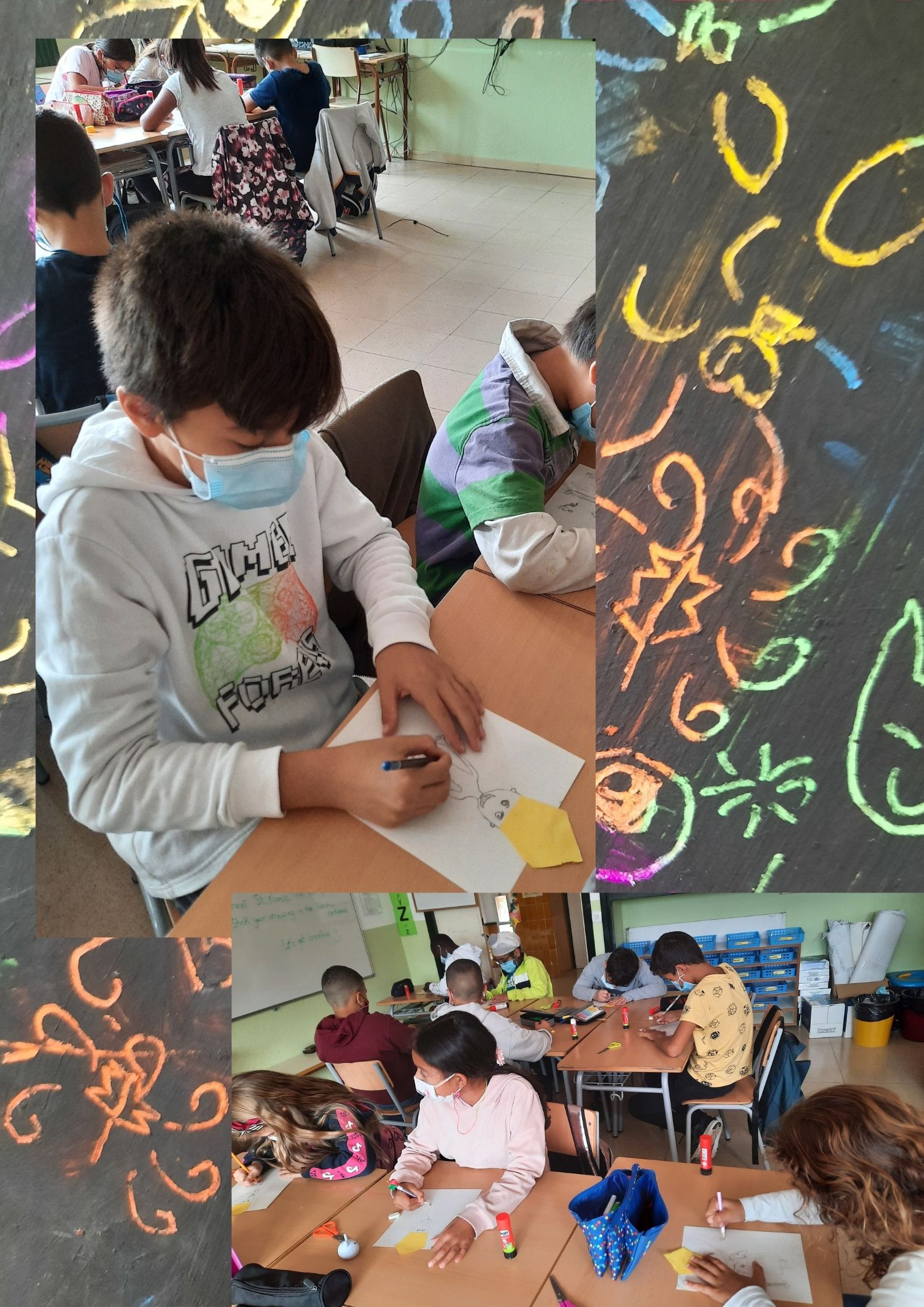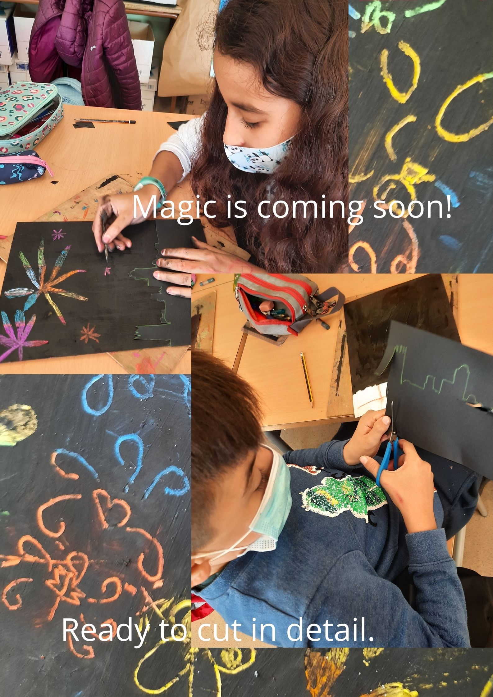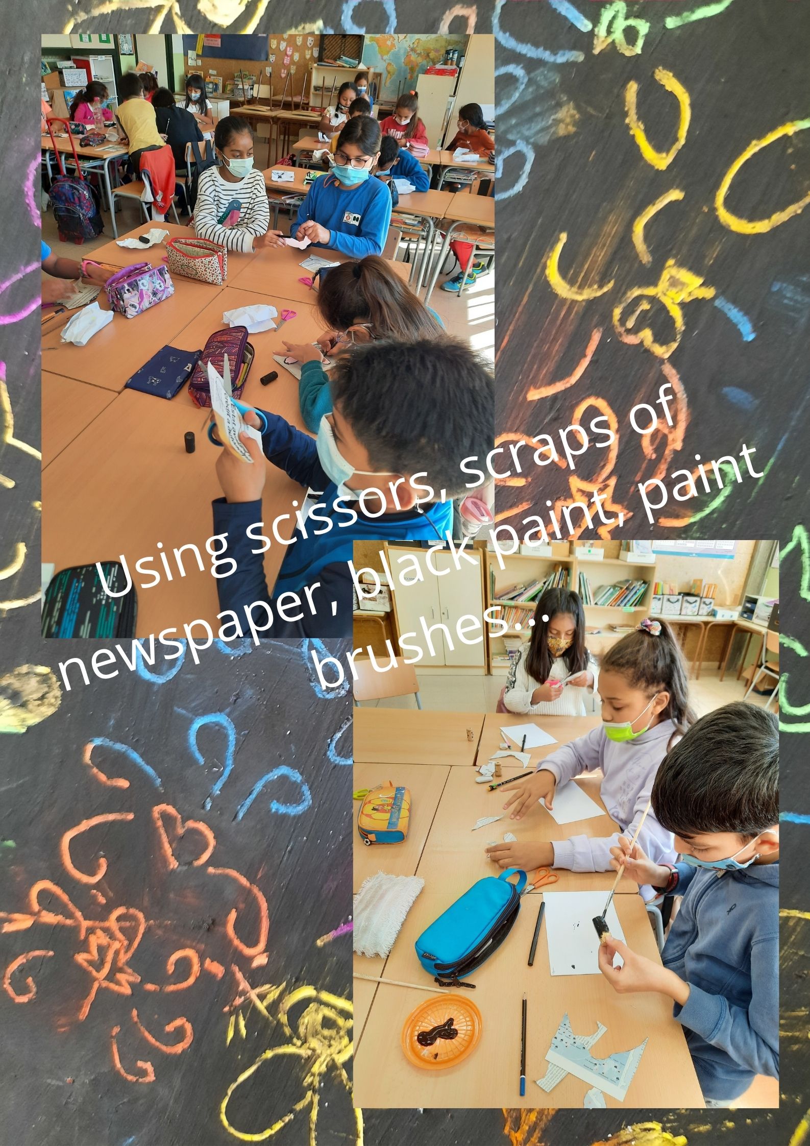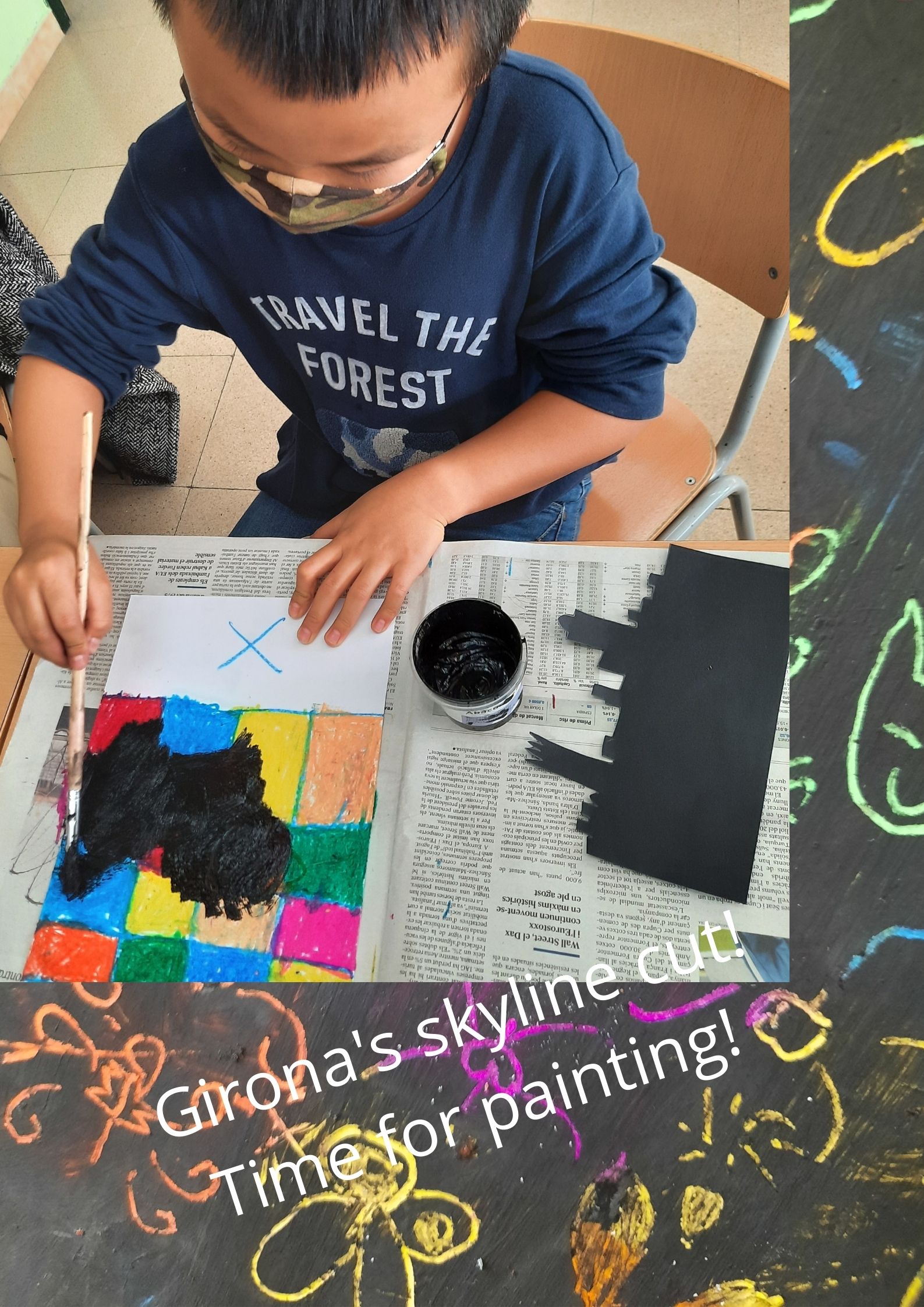 • Cartell de Fires de Sant Narcís  (FAIR POSTER) using wax, opac black paint, toothpicks, black cardboard for Girona’s skyline, scissors and glue. We draw lots of things and we discovered in the picture hidden drawings such as masks, fire works, a heart, Cocollona’s dragon, chestnuts, flowers, an apple, a leaf, Sant Narcís Protector of Girona, a fly, …