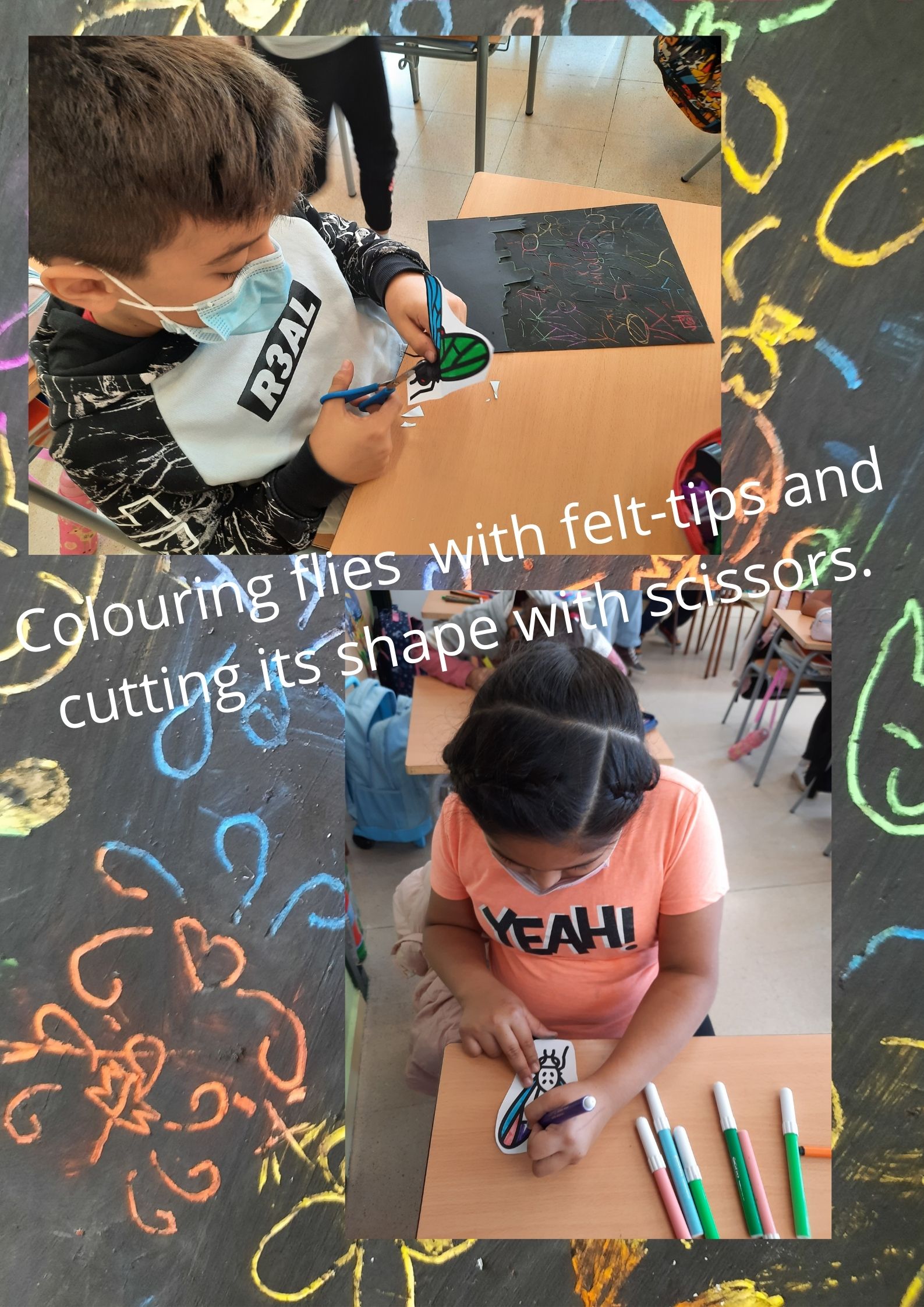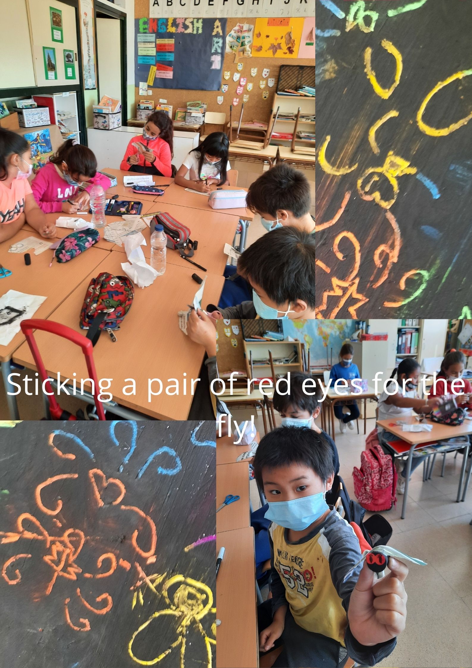 • A cute fly (Mosca de Sant Narcís) to decorate our artworks in the corridor. We needed a cork, black paint, scarps of newspapers for the wings, a black marker and a couple of red stickers to stick the eyes.