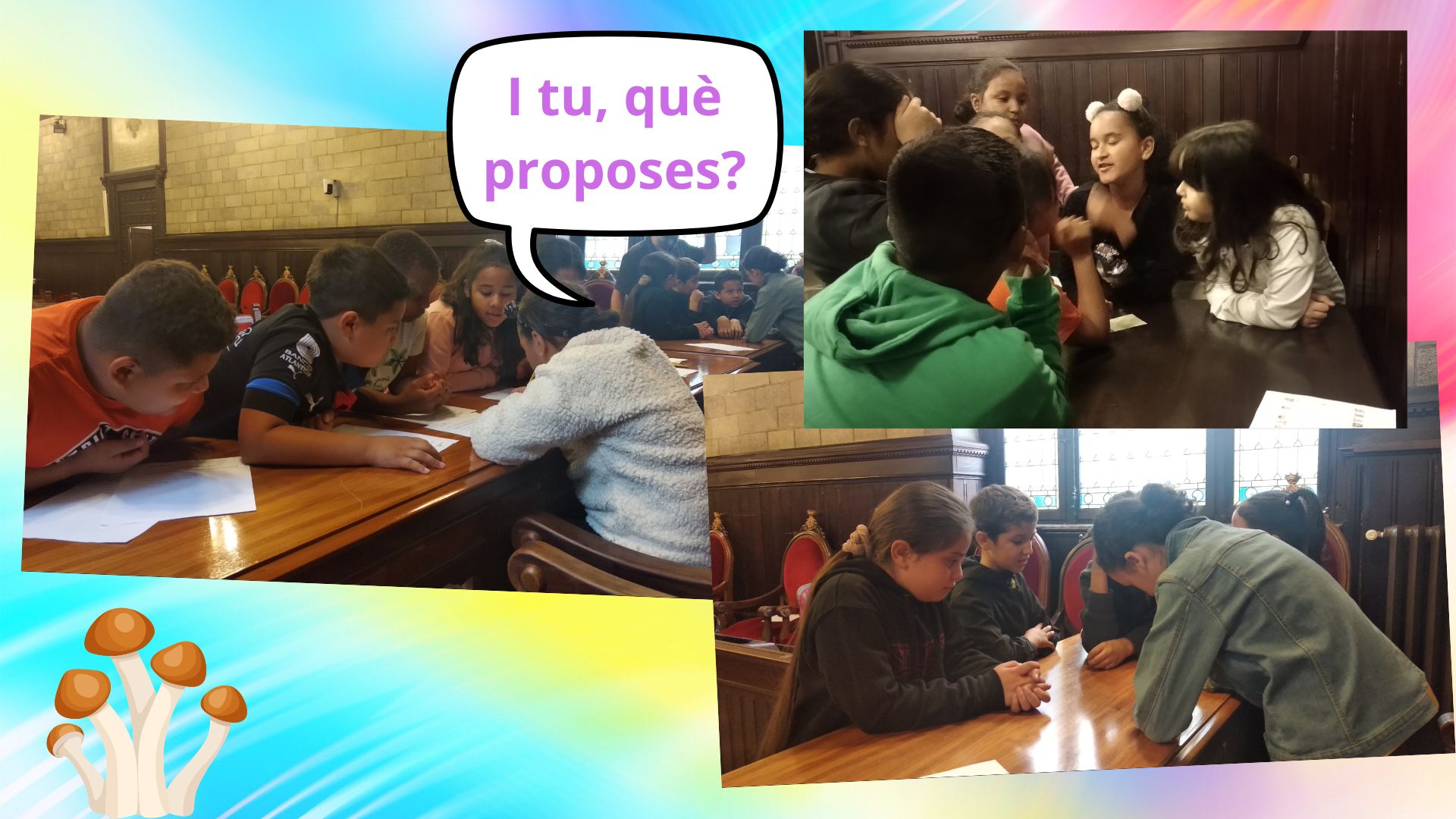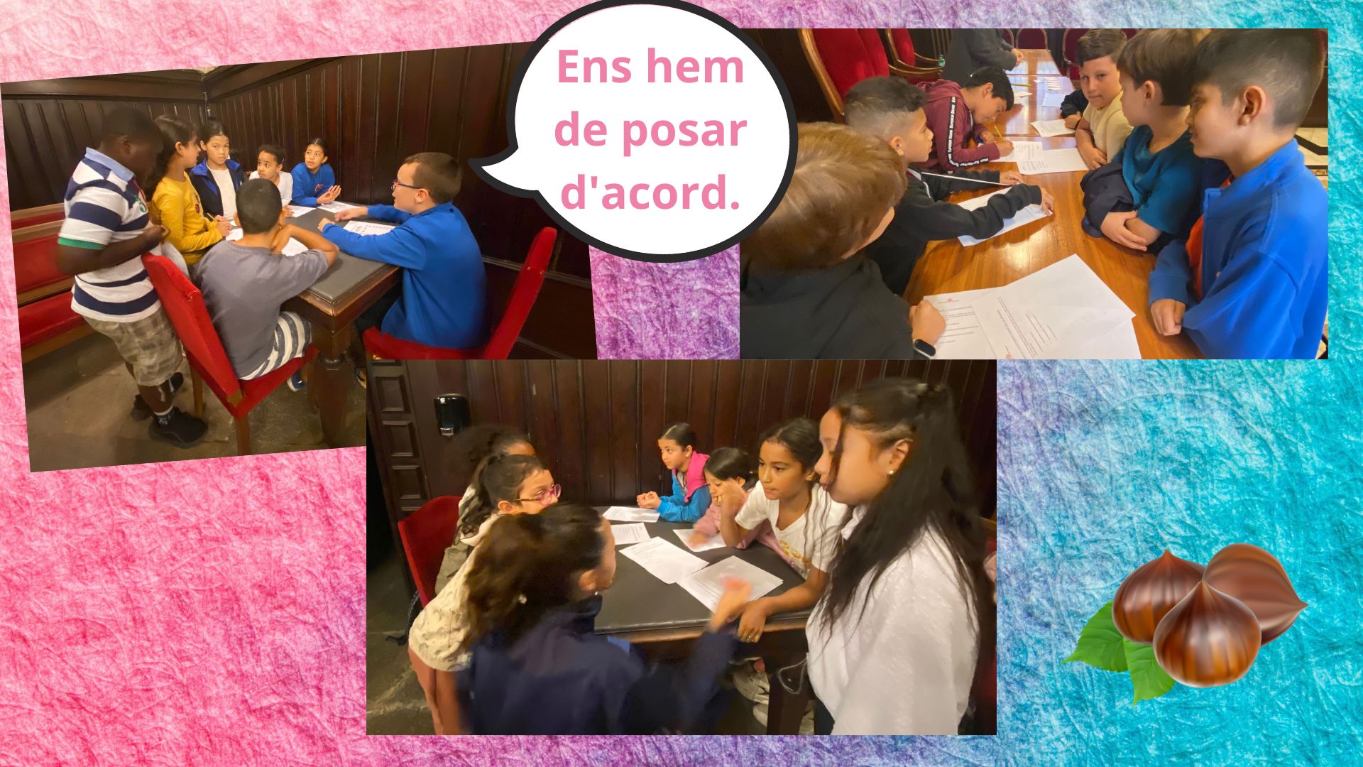 A dins de la sala de plens, hem fet tres grups amb un representant a cada un. El guia feia d’alcalde i els representants de cada grup, de regidors. Tots asseguts, el guia ha proposat debatre un tema: com arreglar el Pont de Ferro o Eiffel. Cada grup s’ha reunit i ha proposat una sèrie d’accions per arreglar-lo. Després els representants han exposat a la resta de grups i al guia les decisions preses al seu grup. El guia ha intentat posar d’acord els tres representants amb unes accions úniques en les què tots tres hi estaven d’acord. Finalment, tothom ha votat en un paperet si hi estava d’acord o no.