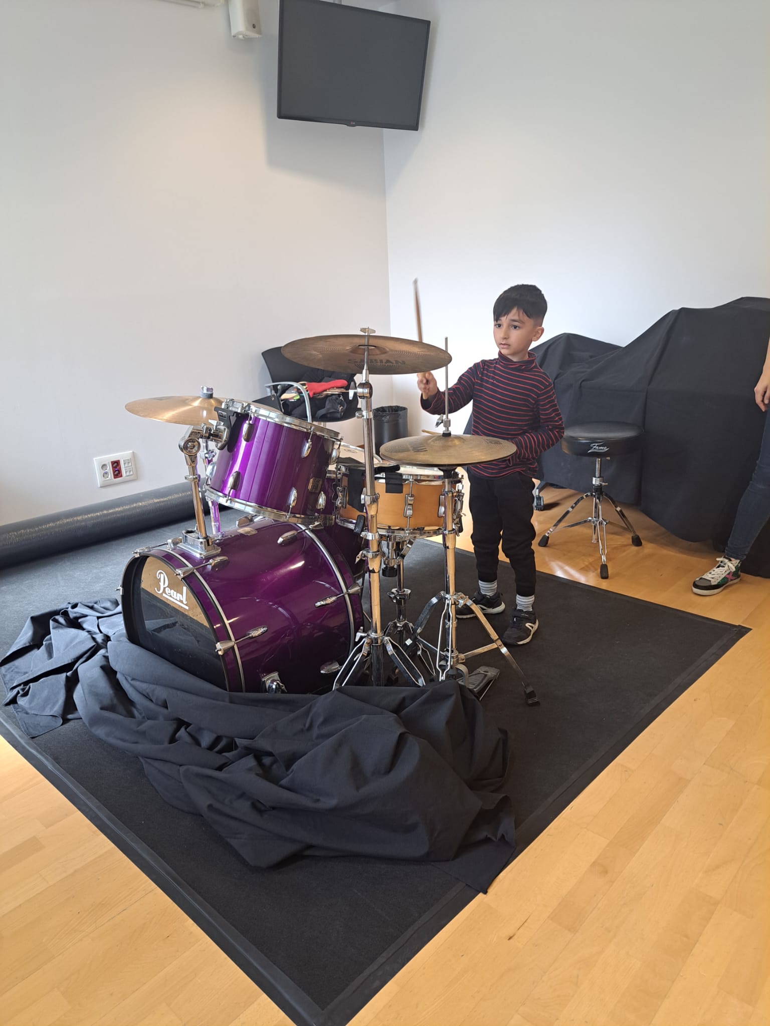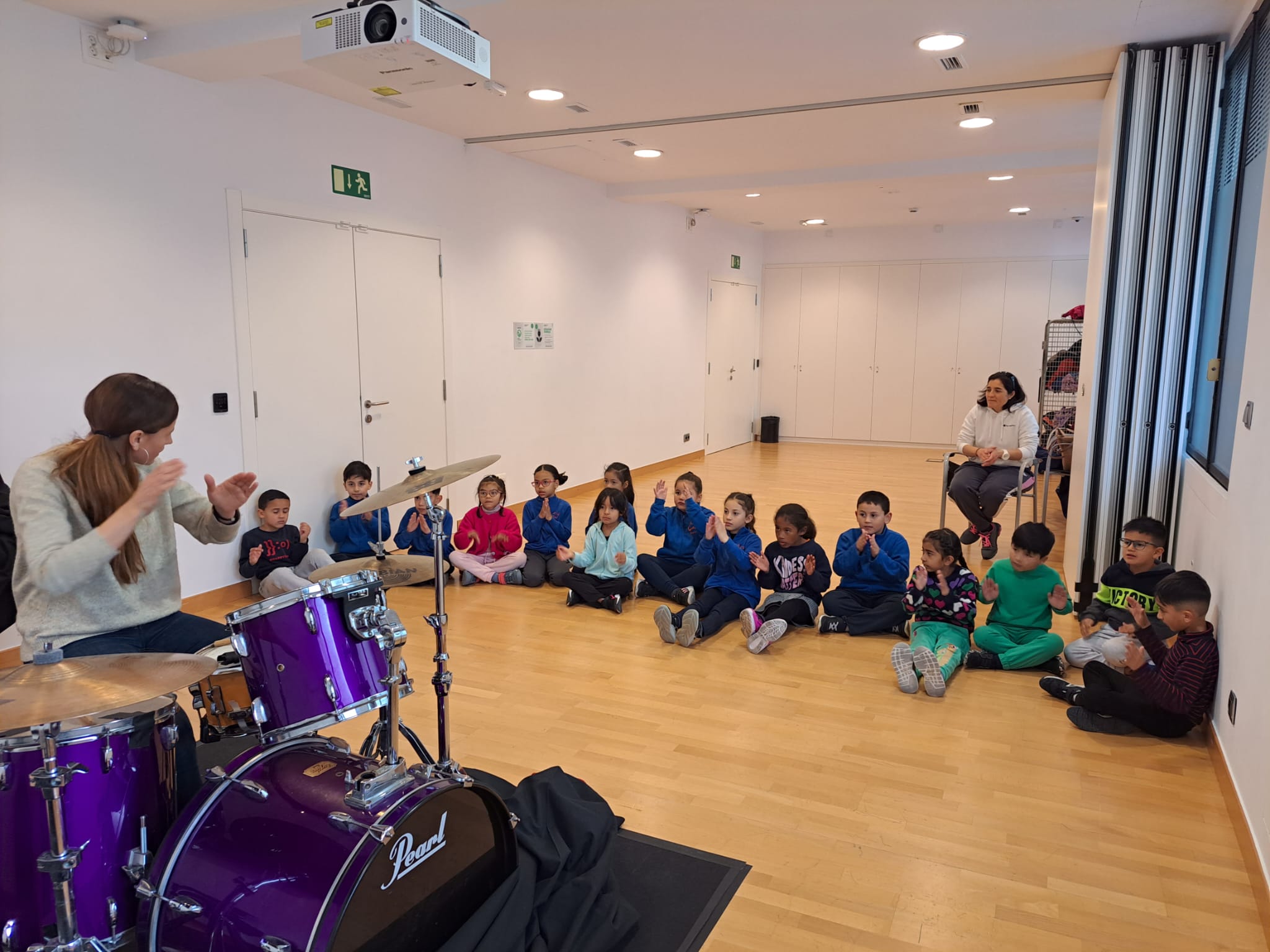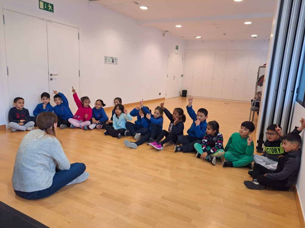 Vam començar amb un exercici de ritme musical corporal, picant de mans, però poc després ens vam animar a seguir-lo tocant la caixa xinesa, el pandero i els bastons. Seguint la versió del conte de la Patufeta que ens va explicar la Laia, vam introduir aquests instruments musicals influenciats pel ritme de la famosa cançó ” We will rock you”. El que més ens va agradar va ser tocar la bateria, tota una experiència!!