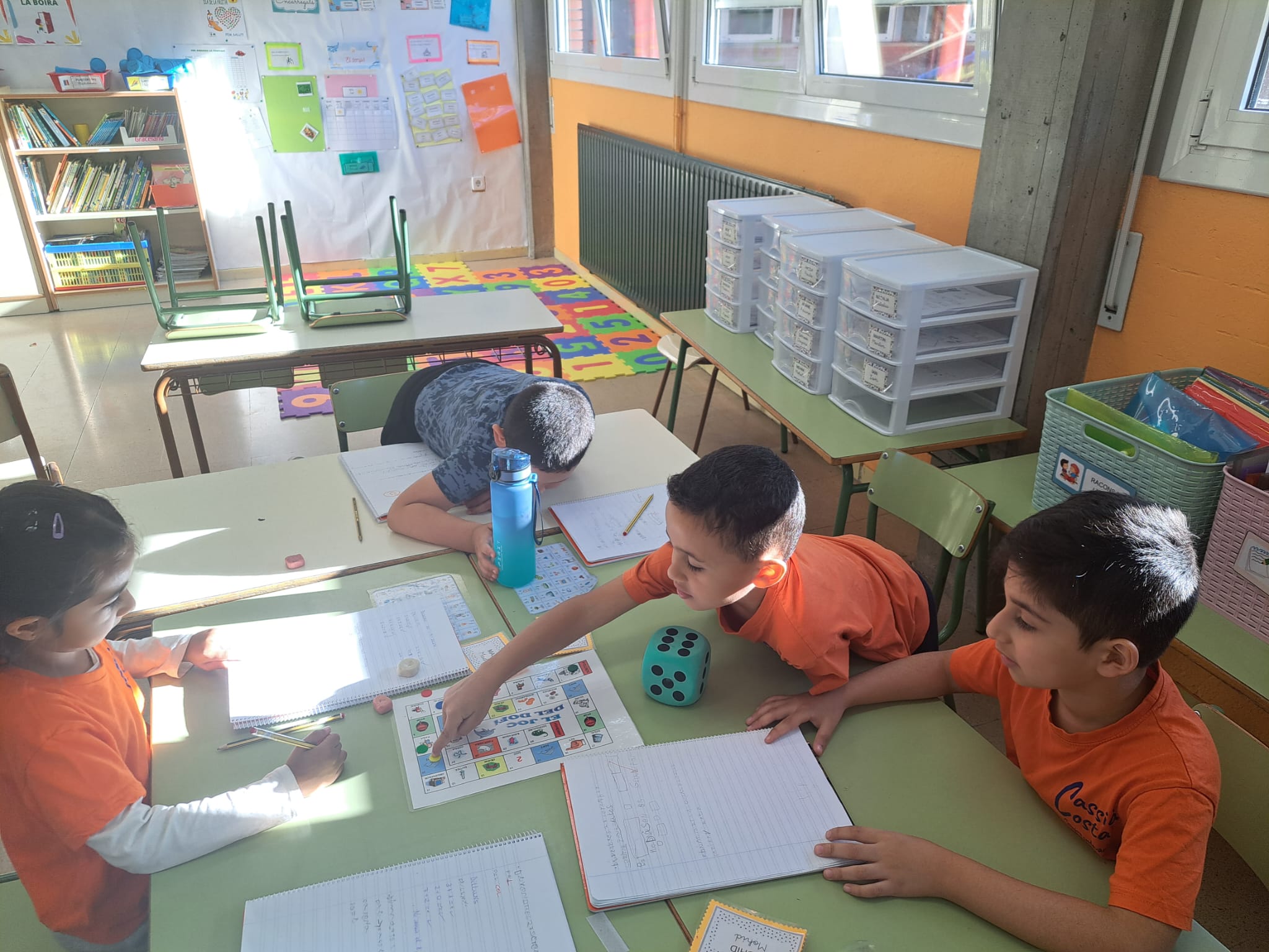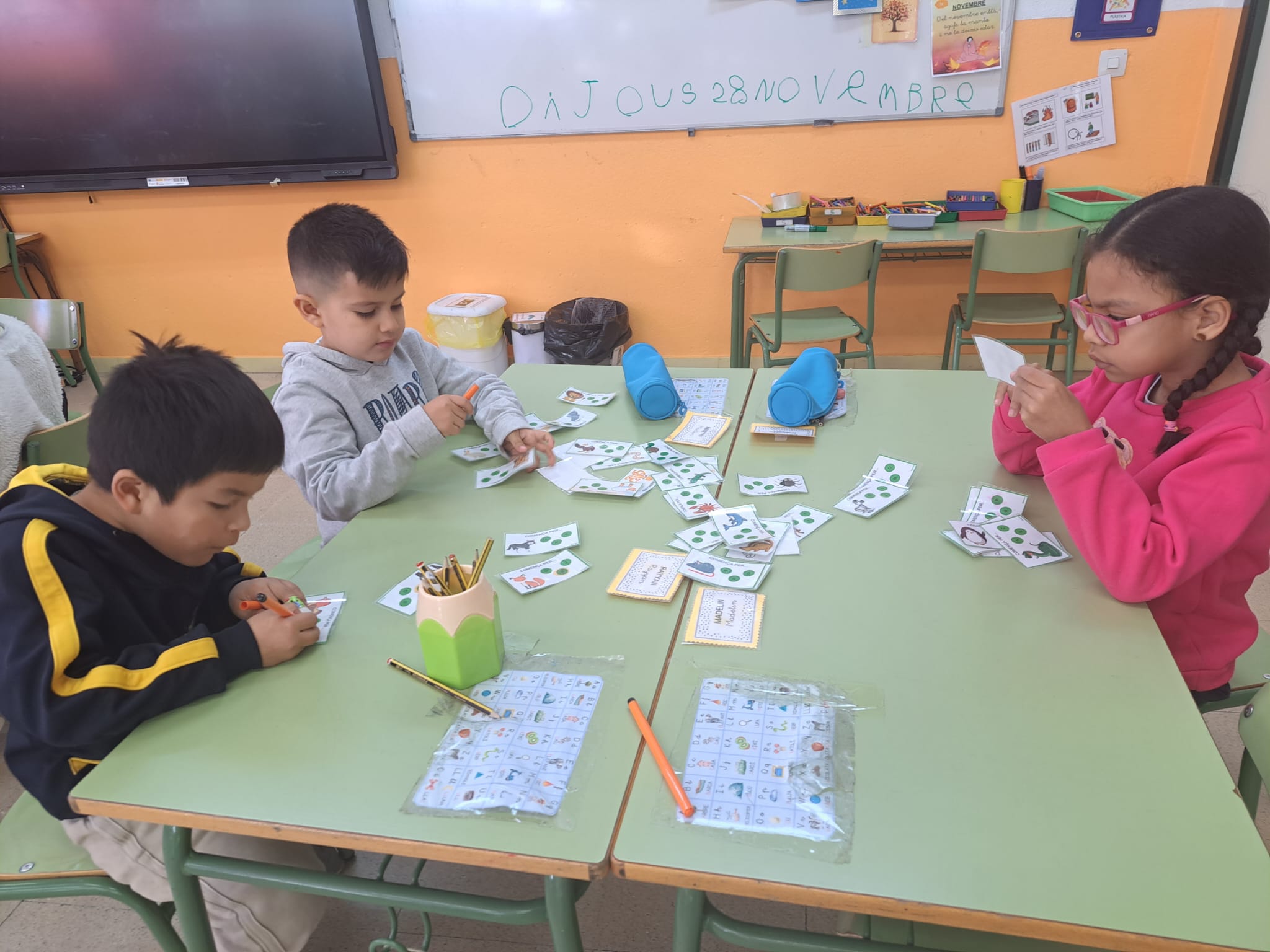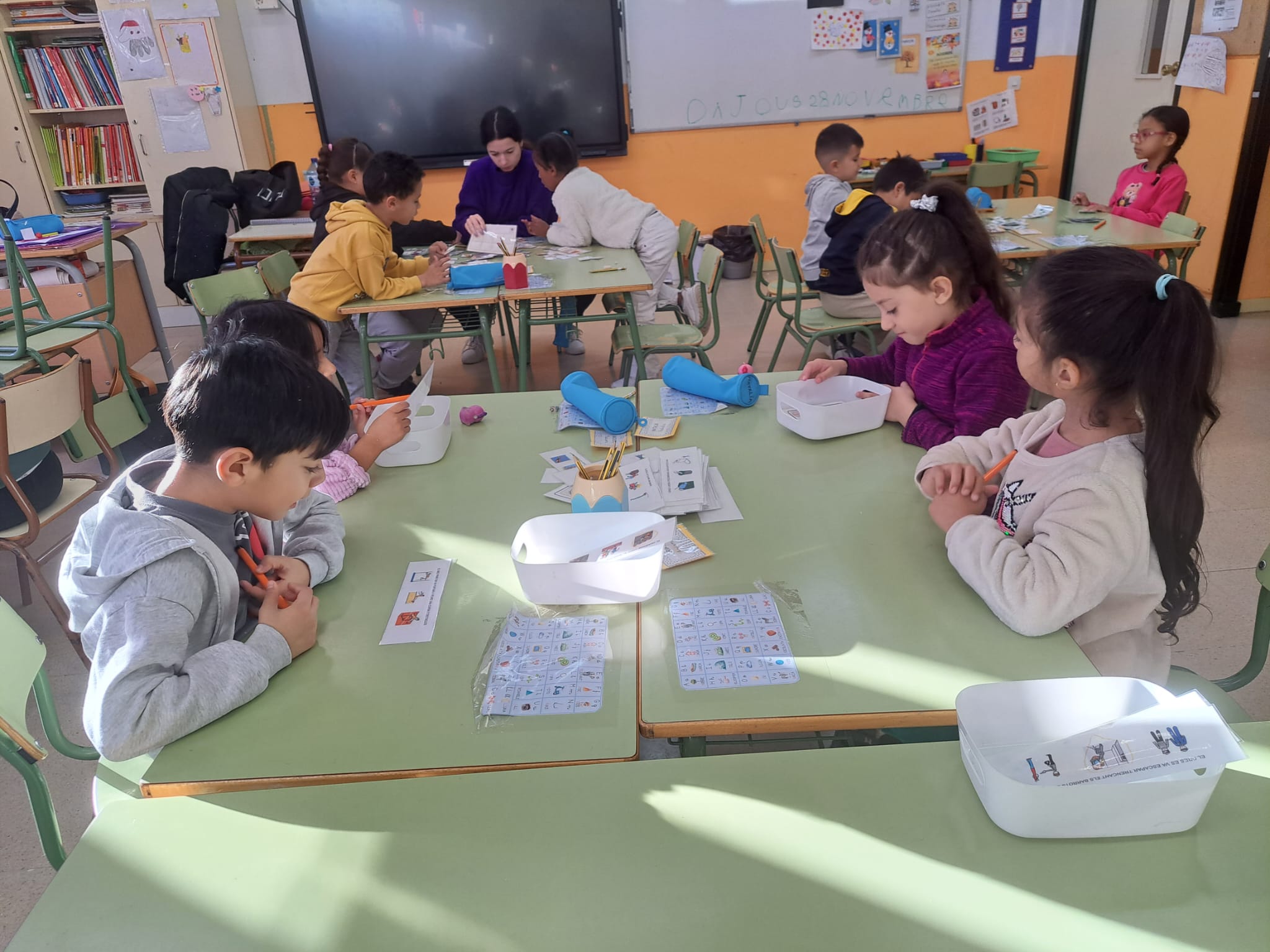 Ens dividim amb grups de quatre alumnes i fem activitats de lectura i escriptura amb material manipulatiu. Ens permet treballar de manera autònoma i flexible, adaptant-nos al ritme de cada infant. Tenim un ventall d’activitats variades: de consciència fonològica, de coneixement de les lletres o sons específics, d’escriptura i lectura de paraules, de frases simples, etc… Cada setmana anem canviant els diferents racons en funció dels objectius i continguts que treballem.