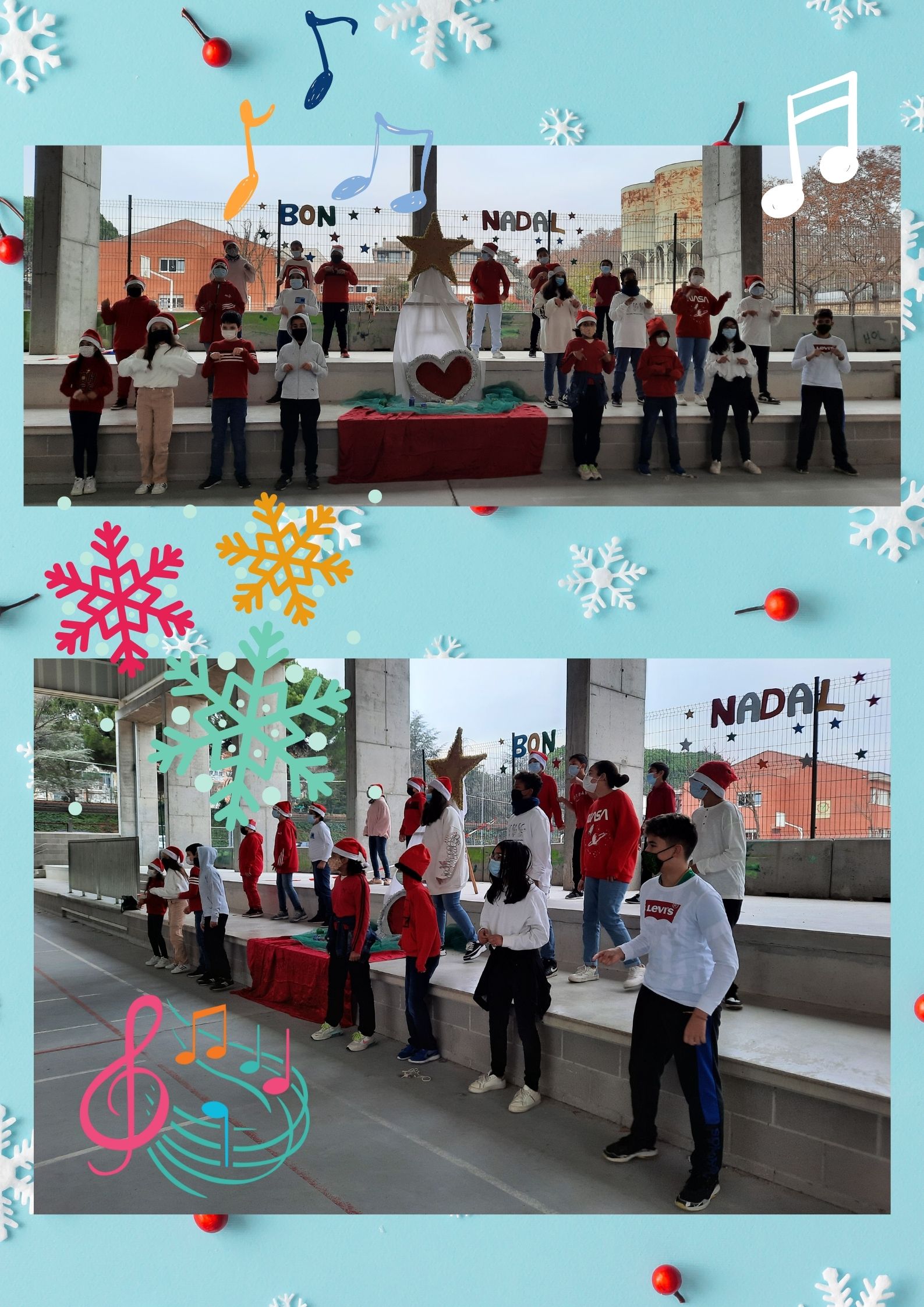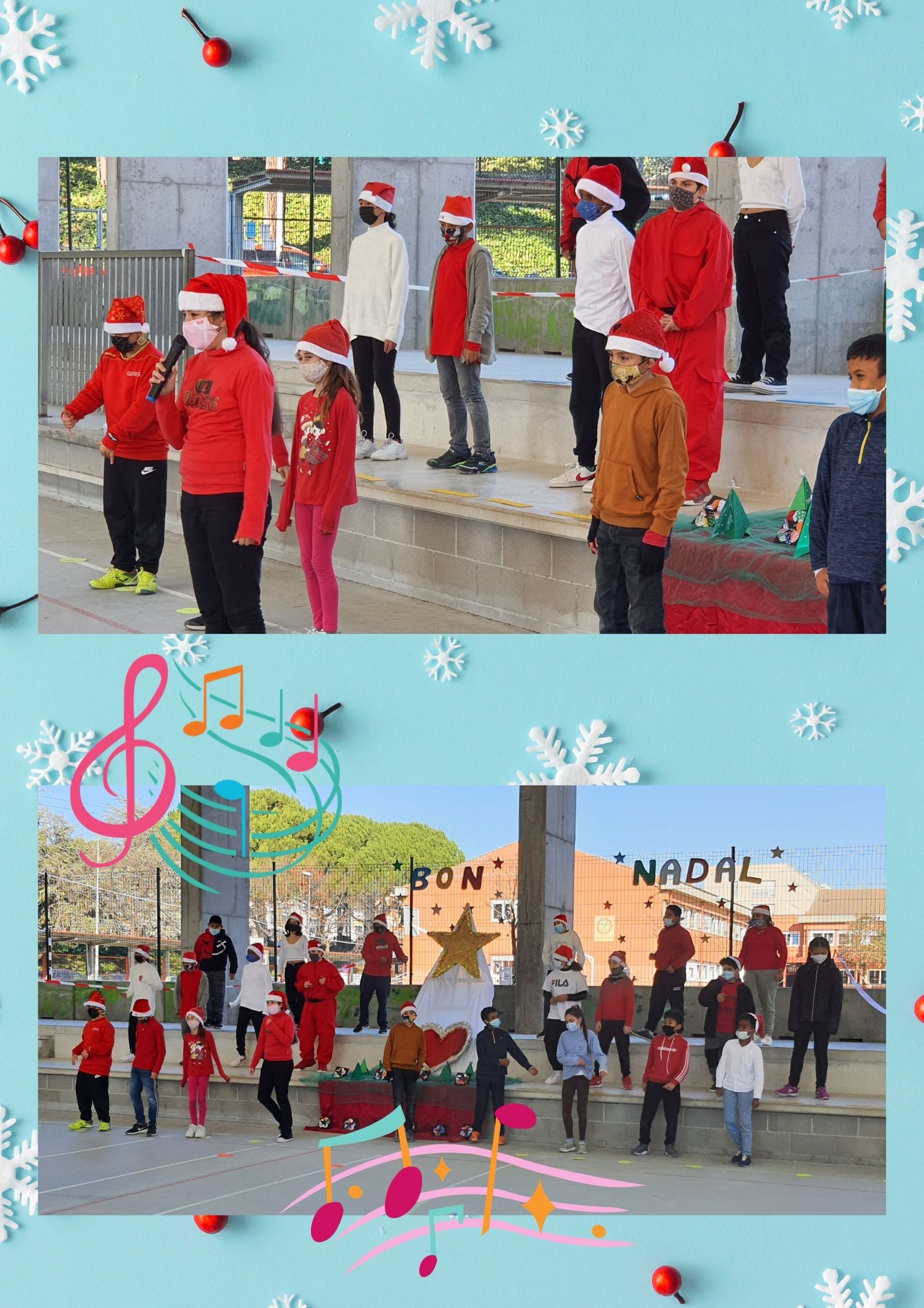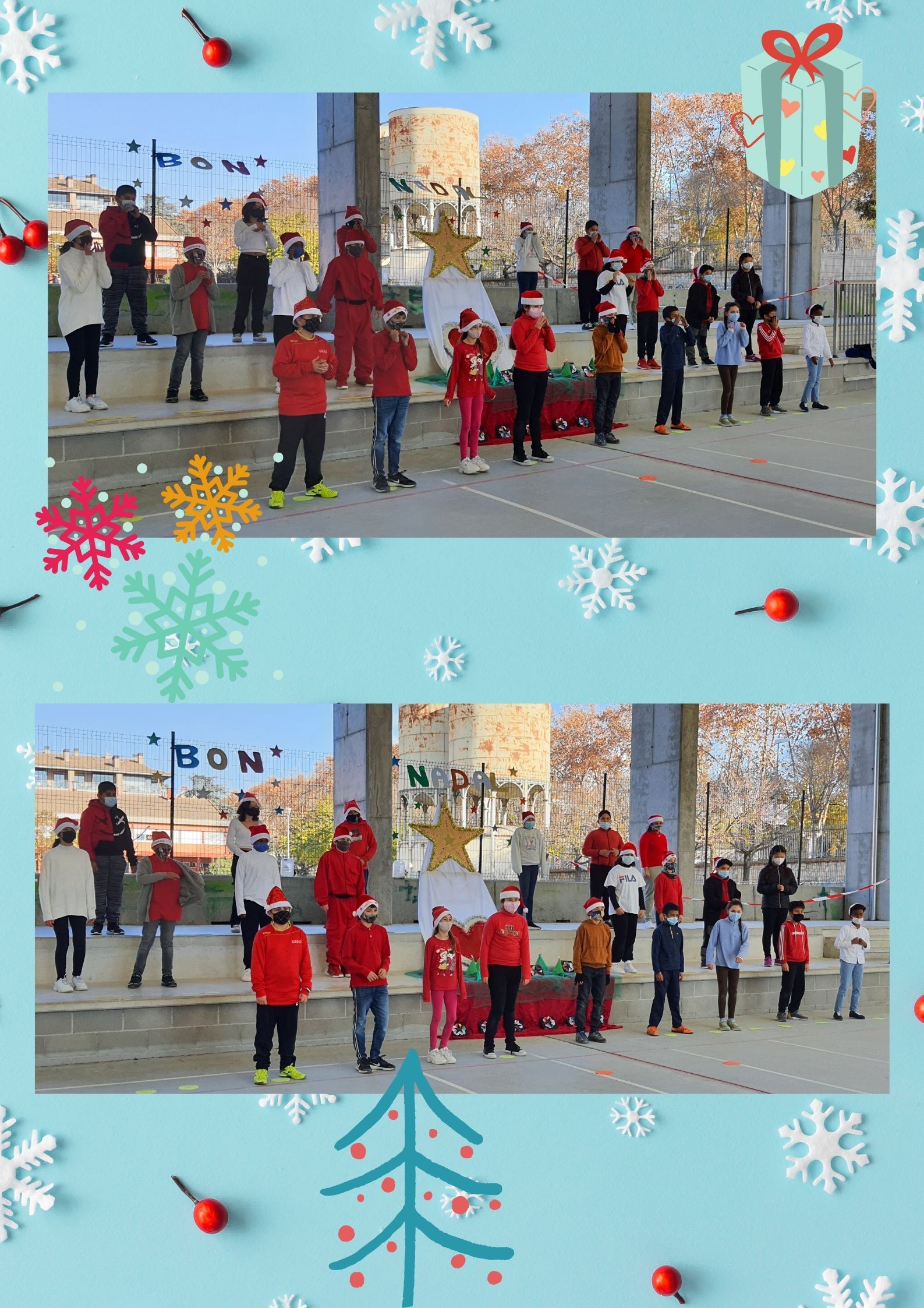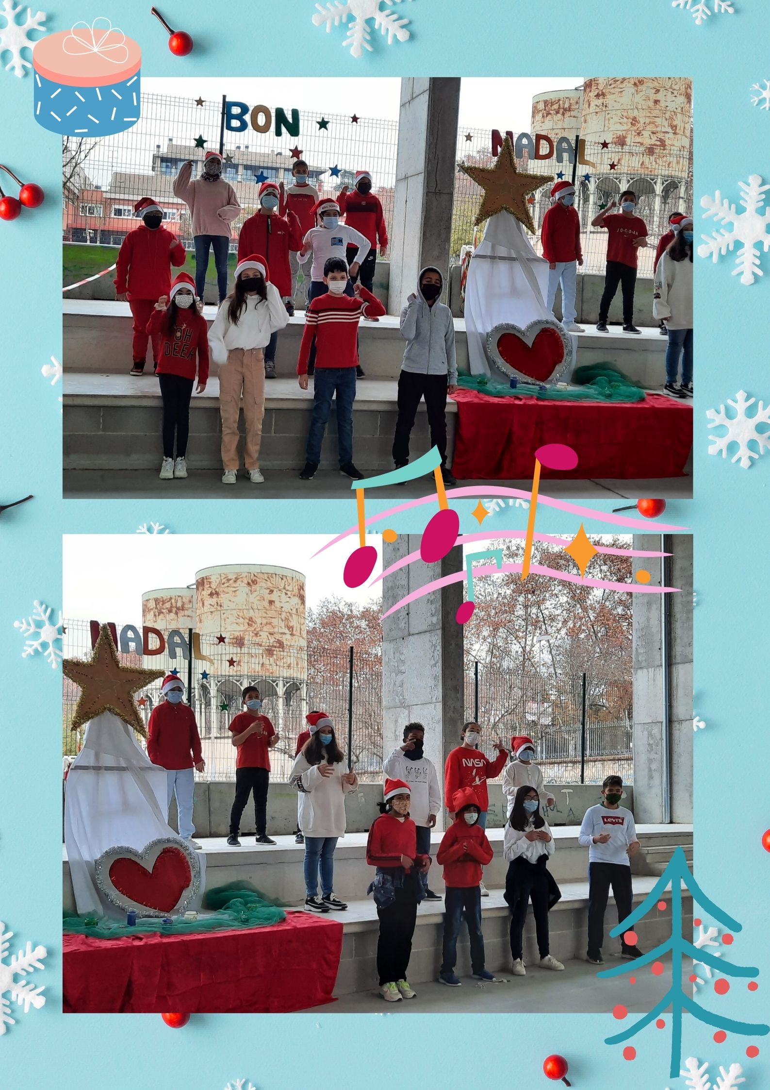 En primer lloc, van cantar la cançó “TRUCA EL NADAL”. Després, van cantar en anglès la cançó “LAST CHRISTMAS” i finalment van recitar el poema “SI FOS A L’ESTIU” de Joan Vilardell.