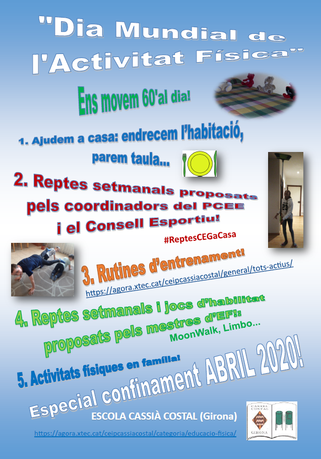 Des del Pla Català de l’Esport a l’Escola, ens vam proposar participar en un concurs, en què havíem d’enviar, abans del dia 1 de maig, un document o un cartell recull de les activitats que estàvem fent durant el confinament i un petit vídeo recull (d’1 minut).