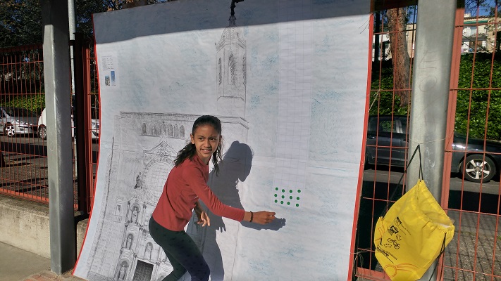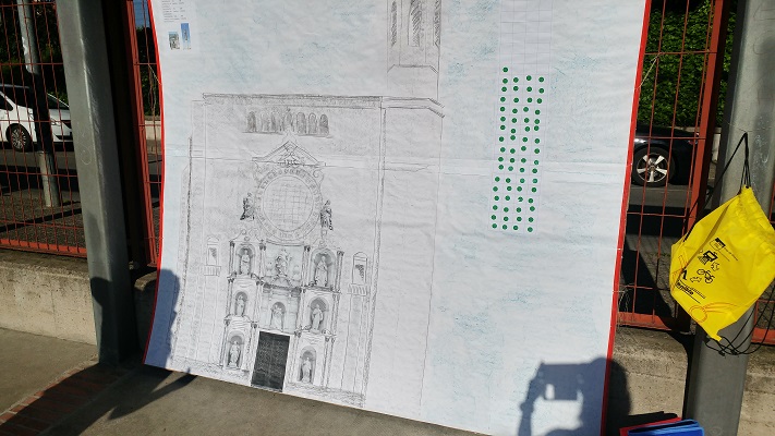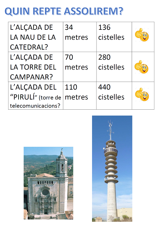 El segon repte ho vam fer a la Gimcana de les Jornades Culturals, menys els de 6è que com que a la gimcana fan d’ajudants ho van fer a una sessió d’EF. Consistia en fer suficients cistelles entre tots els alumnes de l’escola (de P3 a 6è) per arribar a diferents alçades (Catedral i Pirulí). Cada 4 cistelles s’aixecava 1 metre d’alçada , ja que cada pilota de bàsquet fa aproximadament 24 cm. Cada alumne que encertava una cistella enganxava 1 gomet (que li donava l’ajudant de 6è) al mural de la catedral.