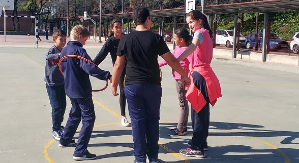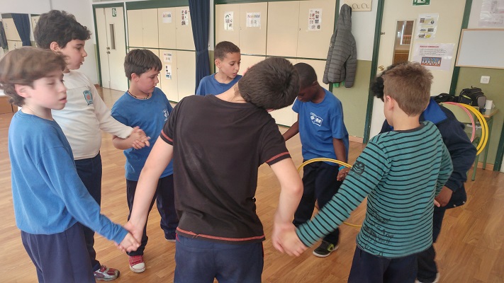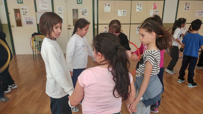 En grups d’aproximadament 8 persones, agafats per les mans formant una rotllana, els alumnes havien de passar un cèrcol entre tots els components del grup sense desfer-se de les mans. Alguns grups ho van fer amb 2 cèrcols alhora.