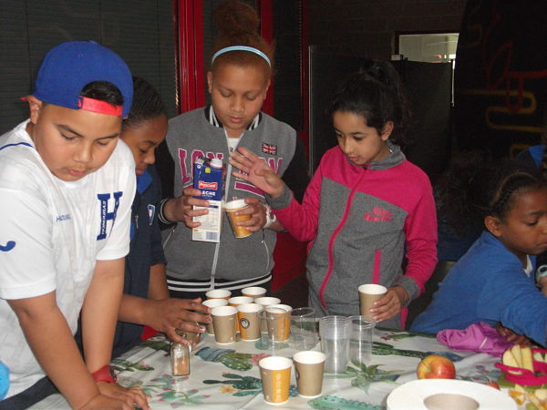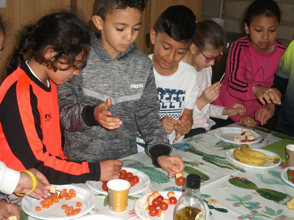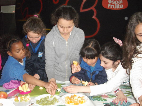 També vam entrar a dins d’una cúpula inflable on ens van passar un vídeo en 3D sobre les fruites. Tot seguit vam fer un taller sobre aliments. Amb diferents fruites, fruits secs i làctics, en petits grups, vam preparar unes brotxetes, batuts i begudes per fer-ne després un tastet. Era boníssim!!!