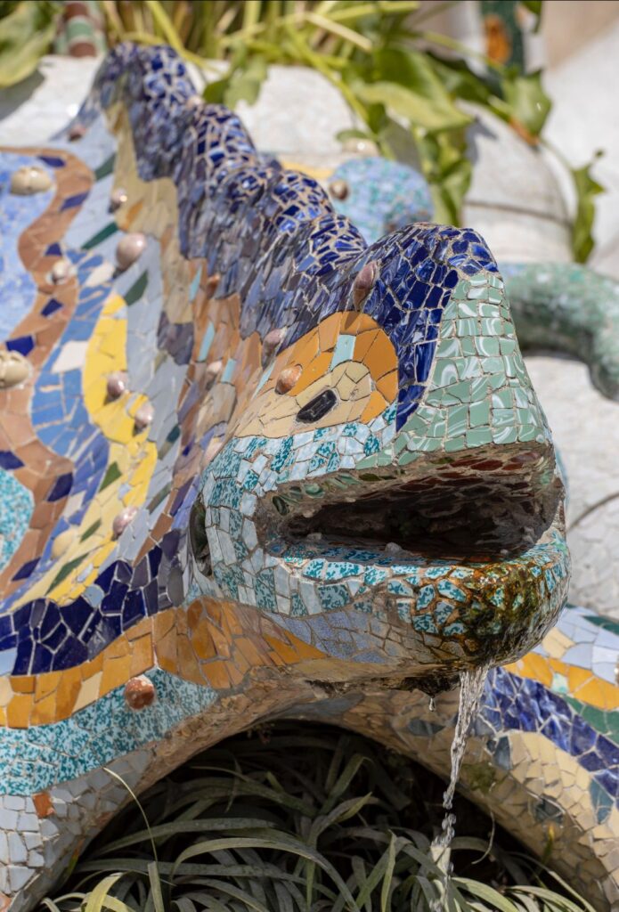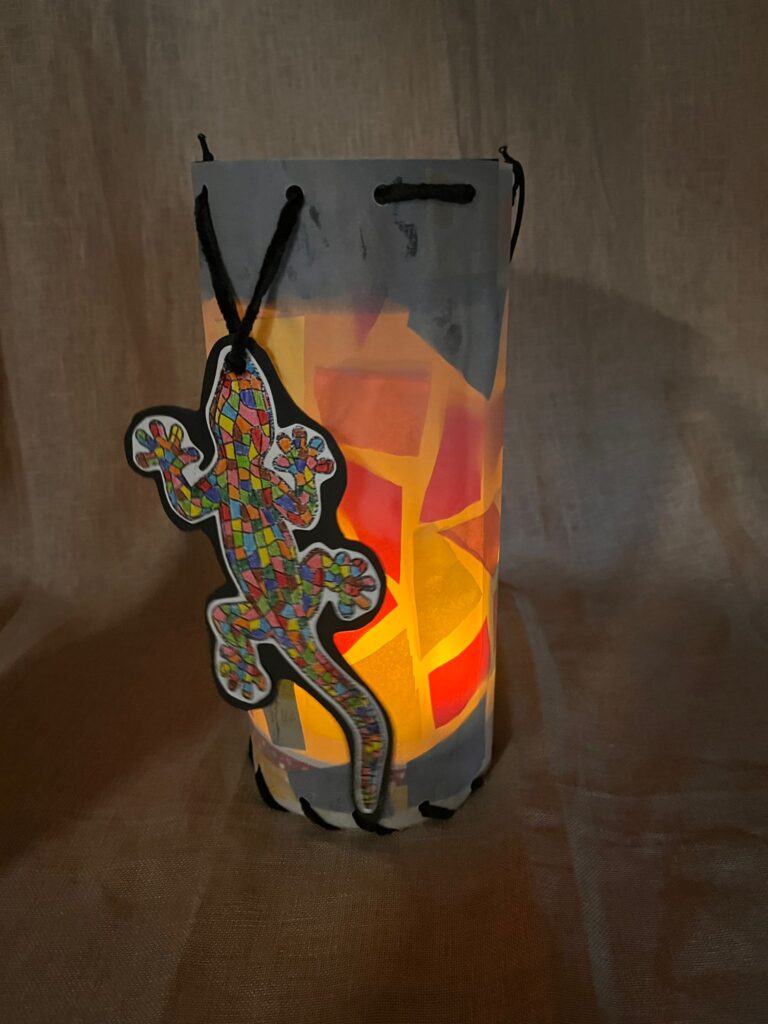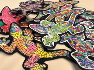 Els infants d’i4 ens hem fixat en com Gaudí utilitzava la tècnica del trencadís en moltes de les seves obres. Així doncs, retallant i enganxant papers de cel·lofana hem fet una base de trencadís de colors, enllaçant-ho amb la salamandra del Parc Güell.