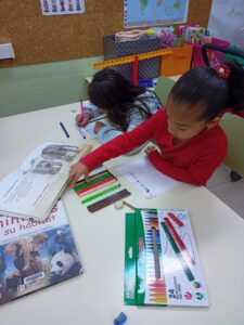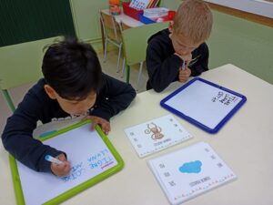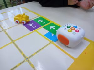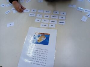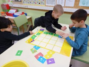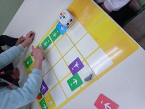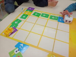 Els alumnes de cicle inicial també hem treballat l’expressió oral i escrita amb jocs de llengua, hem après a ordenar els versos d’un poema, càlcul i numeració amb materials diversos i hem continuat practicant les direccions i l’orientació espaia amb els robots.