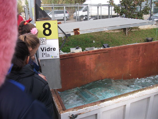 Vam començar a mirar com llençaven cada fracció al seu contenidor. N´hi havia moltíssims i cada un tenia un nom així: vegetals, ferralla, runes, pneumàtics, vidre pla, càpsules de cafè, piles, medicaments, roba, radiografies, etc. Però en el contenidor de ferralla hi havia una motxilla!! Sembla que les persones no entenguin què vol dir RECICLAR. Si nosaltres podem, ells també poden. No només per la motxilla, també perquè hi havia una ampolla en el contenidor de vidre pla i moltes coses més.