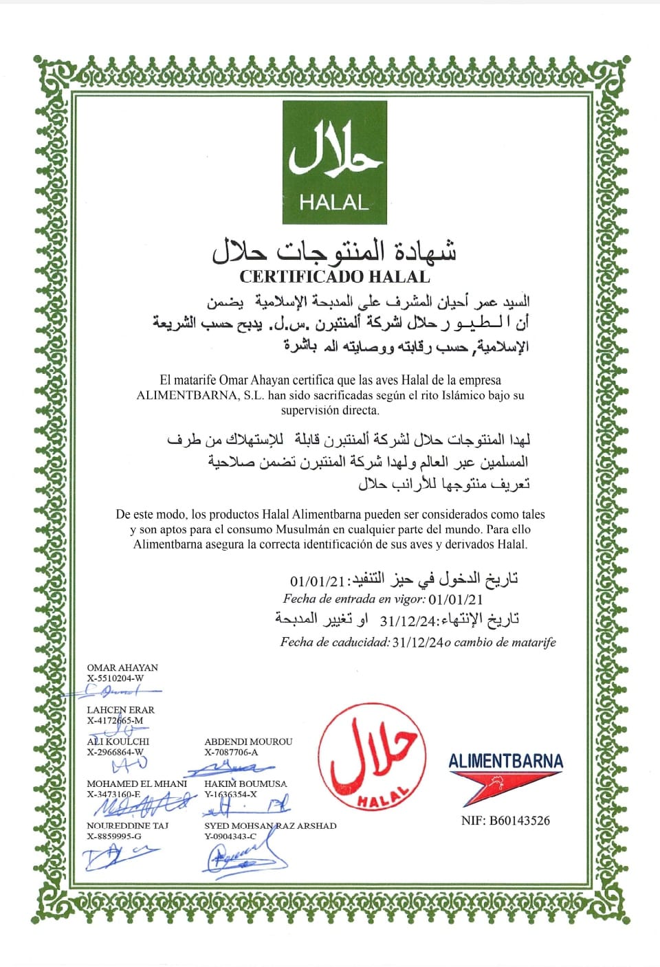 Aquí afegeixo un exemple de menú No-Porc i els certificats de carn Halal.