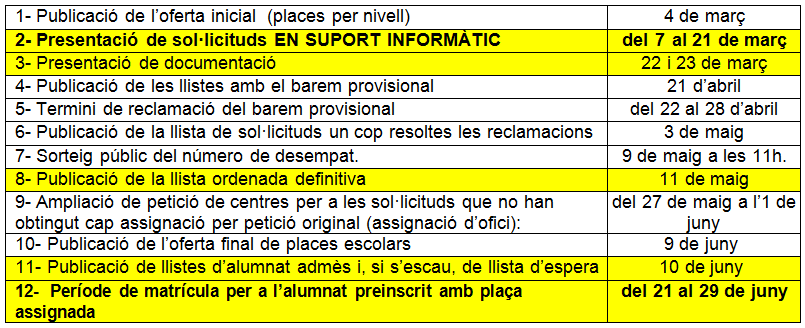 • Cenyiu-vos al calendari establert, lliurar la sol·licitud o la documentació fora de termini us fa perdre tots els drets d’adscripció amb el risc que això comporta de quedar-se sense plaça al centre.