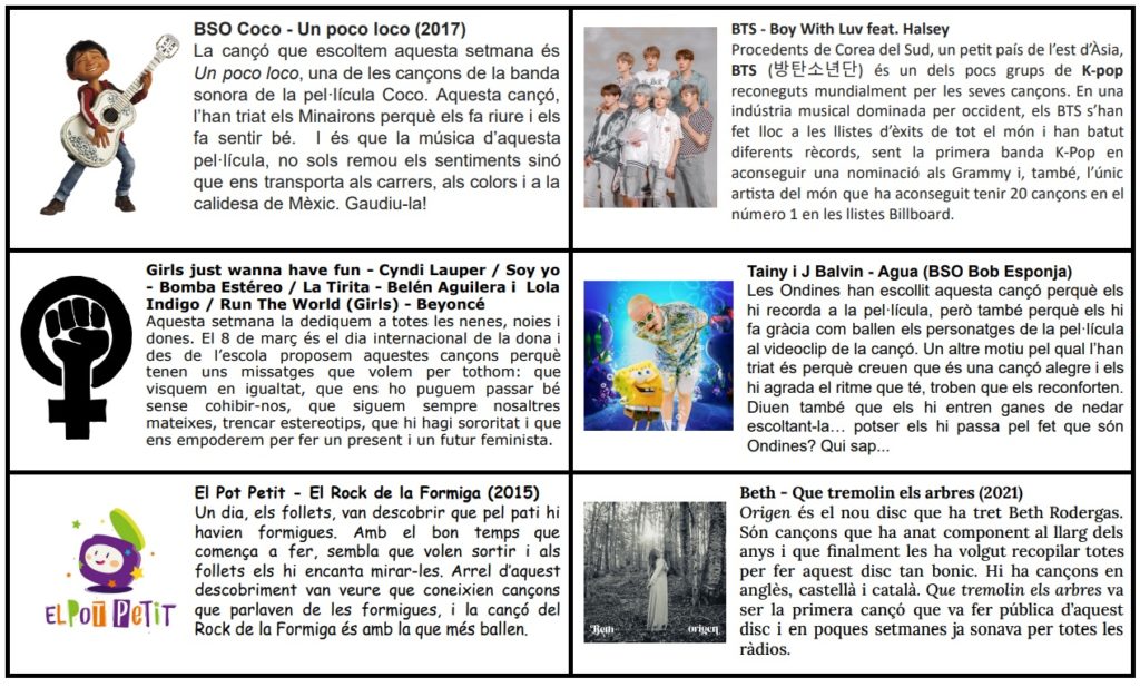 Aquí teniu sis cançons més que han sonat a megafonia. Minairons, Ondines, Follets i mestres són les persones que han triat aquestes caçons que ens han acompanyat a les entrades i sortides de l’escola. Moltes gràcies!!