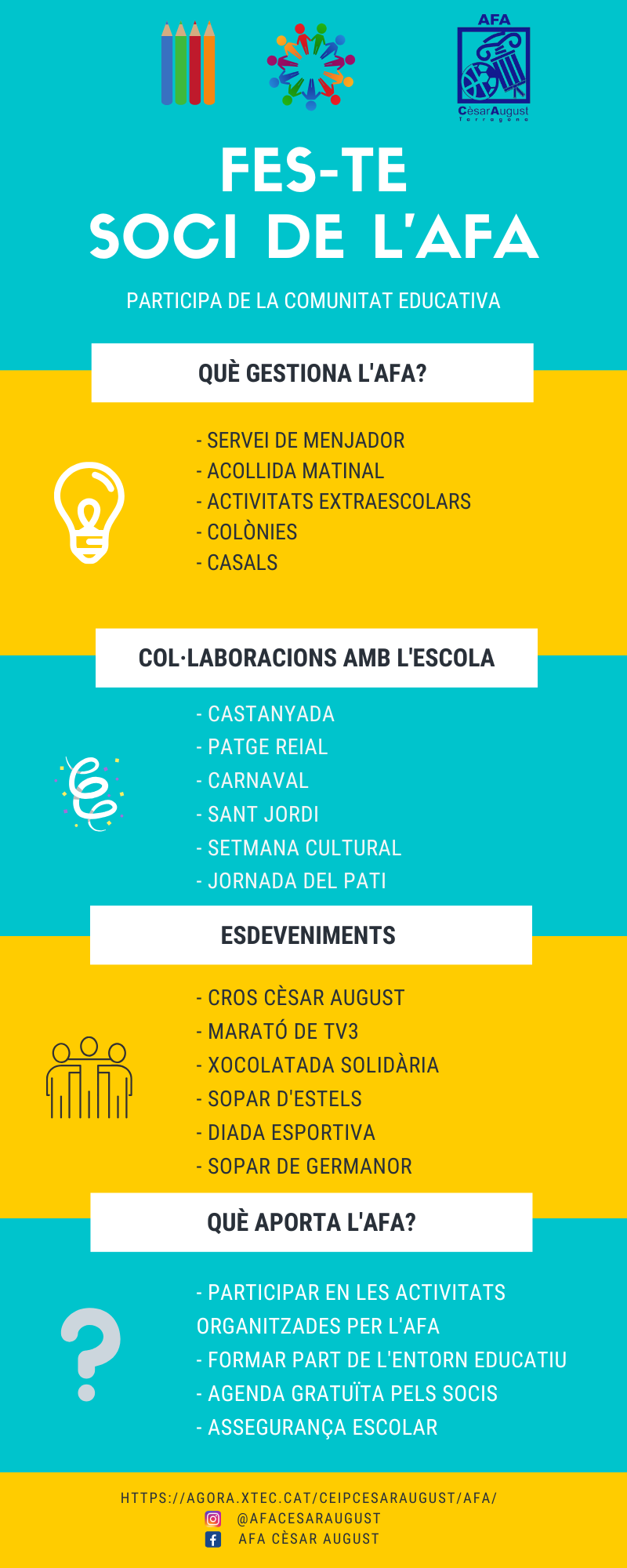Aquesta secció us permetrà obtenir tota mena d’informació sobre les activitats i serveis que gestiona i promou l’Associació de Famílies dels/les Alumnes de l’Escola Cèsar August de Tarragona (AFA).