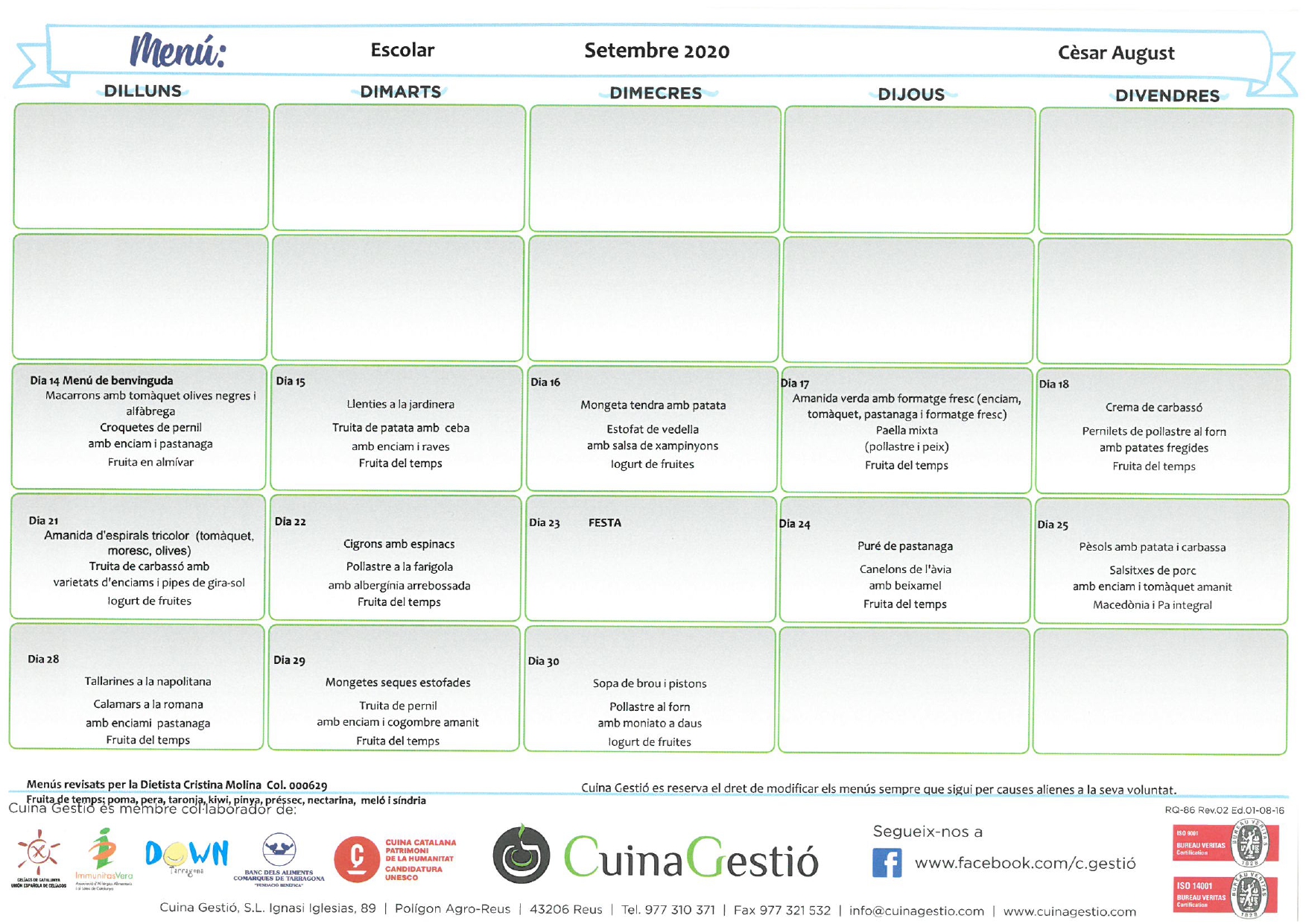 Us fem arribar el menú, la proposta de sopar i els menús amb derivacions, al·lèrgies i intoleràncies del mes de Setembre del 2020 del menjador. A la taula següent trobareu els diferents menús, només heu de seleccionar el que vulgueu consultar.
