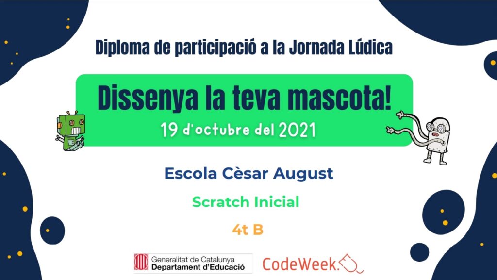 Avui hem rebut els diplomes per participar en la Jornada lúdica de la Codeweek 2021 “Dissenya la teva mascota” scratch