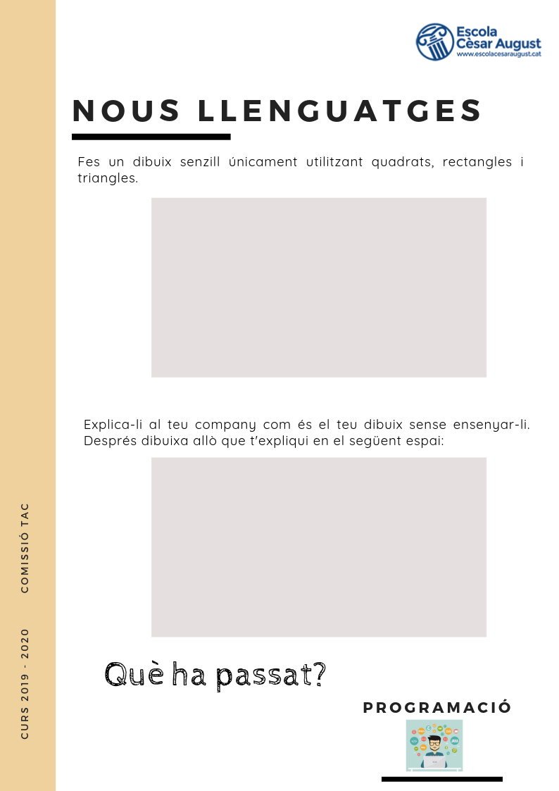 En un primer moment, i amb l’ajuda de la següent fitxa, ha fet una dinàmica per parelles en les que s’han adonat de que el programador ha de donar unes instruccions molt específiques a l’aparell que estigui programant si vol que faci exactament el que té pensat.