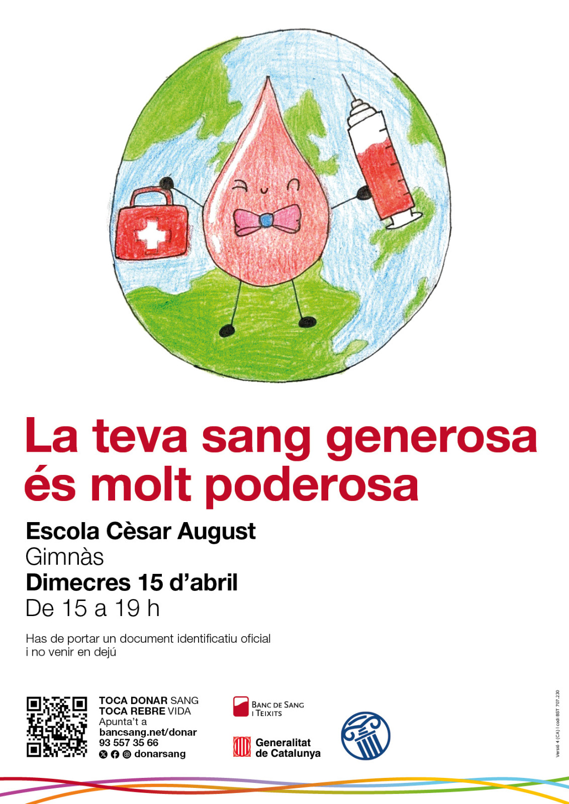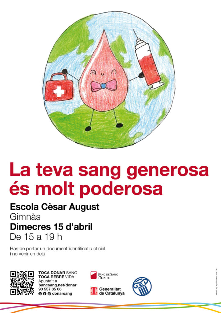 El proper dimecres 15 d’abril de 15h a 19h l’alumnat de 4t ha organitzat una campanya de donació de sang. Si teniu entre 18 i 70 anys i peseu més de 50kg, animeu-vos a donar sang! Amb mig litre de sang podeu salvar 3 vides! Amb 15 minuts podeu fer feliç molta gent! Podeu reservar hora en aquest enllaç.