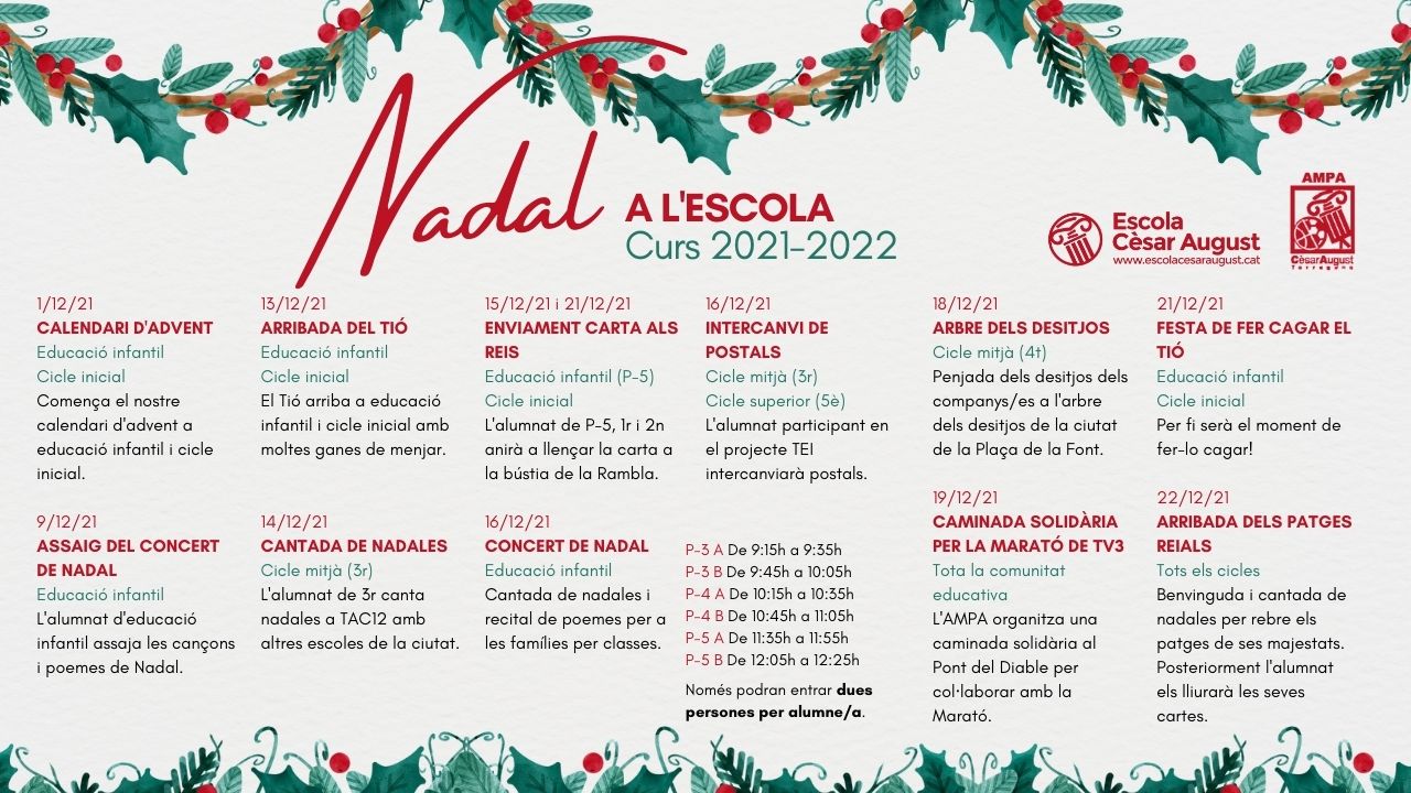 Nadales, postals, cartes als Reis, calendari d’Advent, arbre dels desitjos, caminada solidària, el Tió, l’Amic invisible, la rebuda dels patges reials… Aquestes són algunes de les moltes acitivitats que realitzarem durant el mes de desembre per celebrar el Nadal. Podeu veure’n tot el detall al programa. Bones festes!