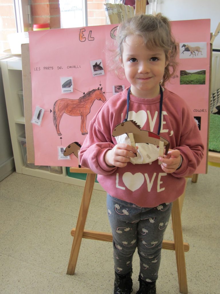 LA FEMELLA ÉS LA EUGA I EL FILL ÉS EL POLTRE. HEM ESCOLTAT EL GALOP DEL CAVALL, COM RENILLA AMB LA CANÇÓ CLOP, CLIP, CLOP. ENS HA PORTAT UN DIBUIX DEL CAVALL I UN CAVALL FET DE CARTRÓ I L’HEM FET GALOPAR AMB LA CANÇÓ.
