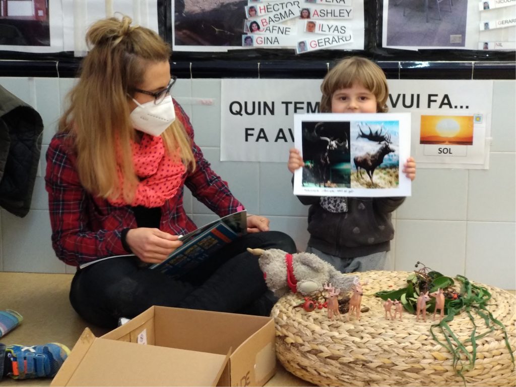 La Neret ens ha portat molta informació dels cérvols. Ens ha ensenyat diferents imatges, ha portat diverses figures de cérvols, un peluix, un conte i, fins i tot, ha imitat el soroll que fan. Arrel d’aquesta explicació, la Mireia ens va portar unes banyes de cérvol de veritat i les hem pogut veure i observar amb lupes. Ens ha explicat que els cérvols cap a la primavera fan el canvi i els hi cauen les banyes i que els ratolins de bosc se les mengen perquè estan fetes de calci. Si cliqueu sobre la foto podreu veure més imatges de la recerca de la Neret.