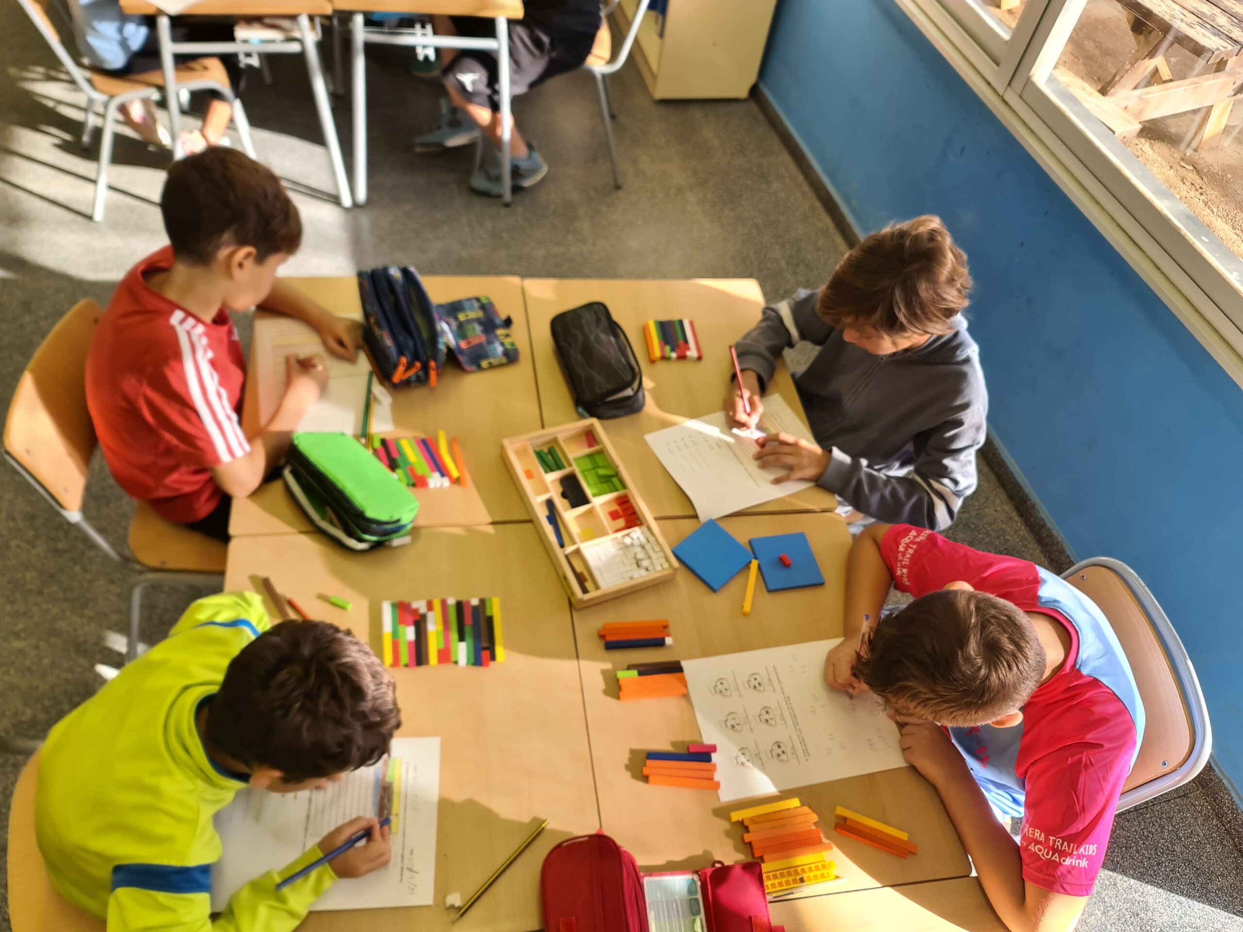 - Matemàtiques vivencials: aquest curs 24-25 hem entrat de ple en l’ensenyament de les matemàtiques manipulatives i raonades a partir de l’aprenentatge d’estratègies múltiples de càlcul. Treballem tots els conceptes matemàtics basant-nos en les 3 fases per a l’aprenentatge proposades per Jerome Brunner: manipulativa, representativa i simbòlica. A través de la vivència, la verbalització i l’anàlisi. L’alumnat disposa també d’un quadern trimestral per practicar la numeració, el càlcul i la resolució de problemes de forma autònoma i/o grupal, ja que és el bloc amb més pes durant l’etapa d’educació primària. A més a més, treballem la resta de blocs (mesura, estadística i atzar i geometria) a través de reptes, activitats manipulatives, jocs, etc. dins dels espais, roda d’aprenentatges o treball en petit grup.