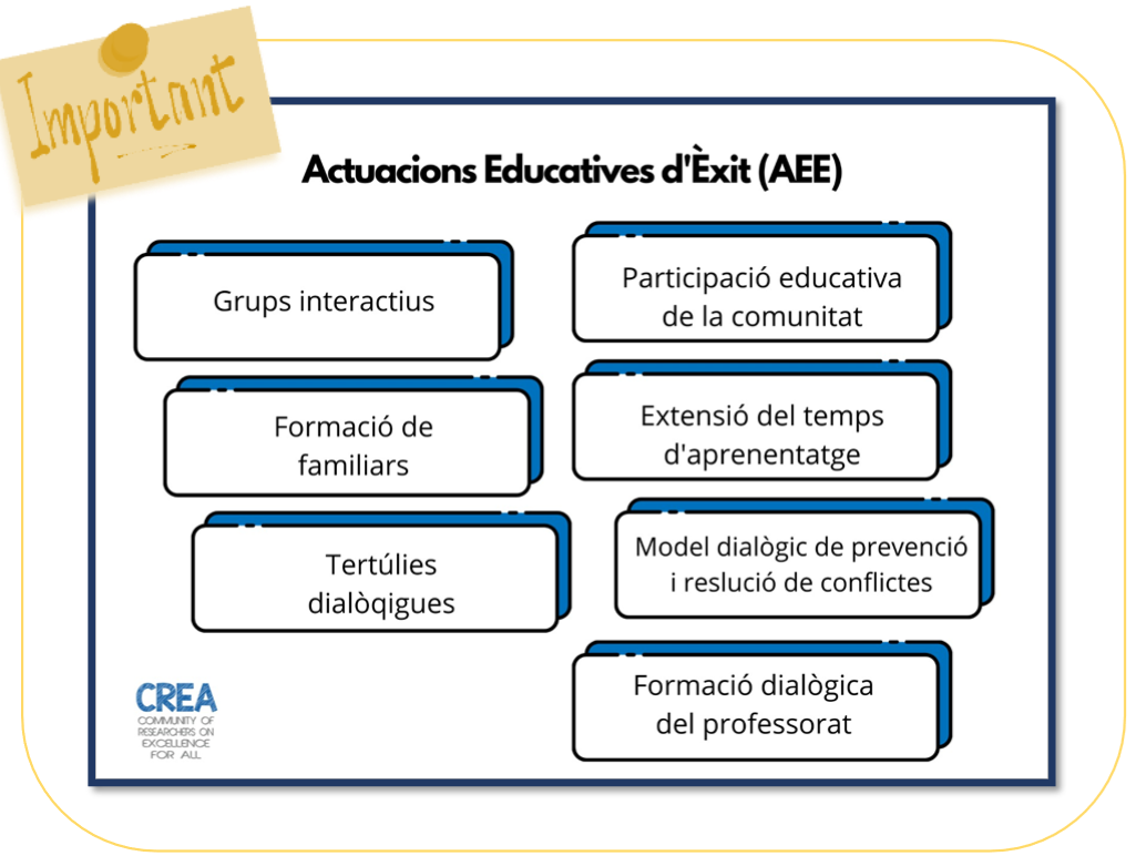 Les actuacions educatives d’èxit (AEE) és defineixen com aquelles pràctiques educatives que la comunitat científica internacional ha demostrat que contribueixen a millorar l’aprenentatge de l’alumnat i la convivència al centre educatiu.