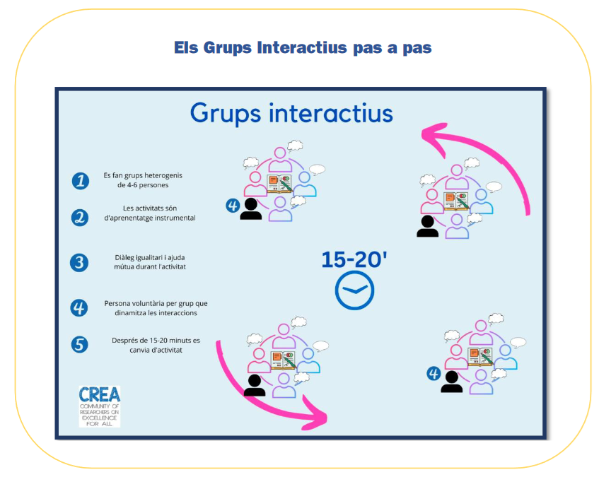 És la forma d’organització de l’espai d’aprenentatge amb millors resultats d’èxit acadèmic i de convivència. A través dels grups interactius es multipliquen i diversifiquen les interaccions, al mateix temps que s’augmenta el temps de treball efectiu.