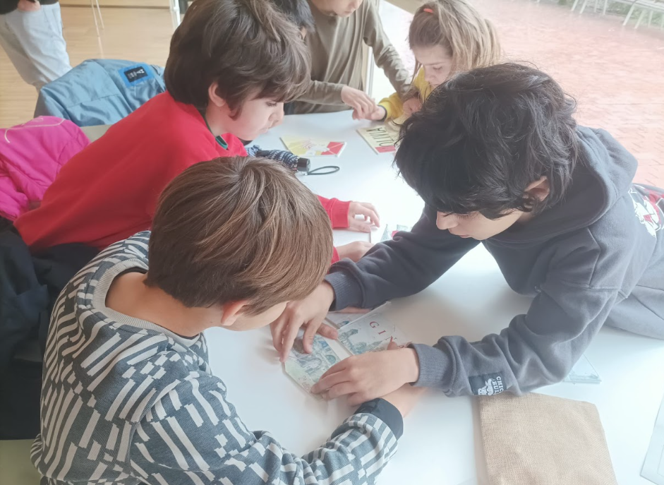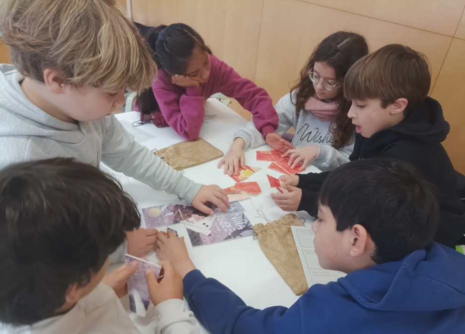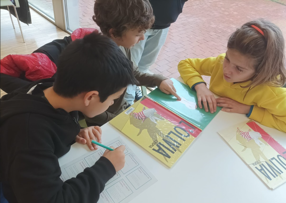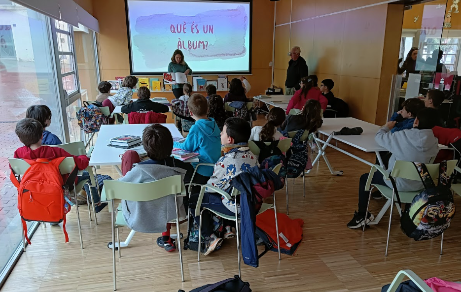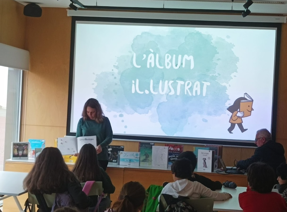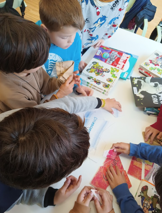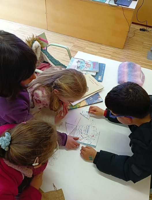 Després, els bibliotecaris i bibliotecàries ens han fet una petita presentació sobre els àlbums il·lustrats; la informació que en trobem als crèdits, com són les cobertes i contracobertes dels mateixos, n’han parlat del poder i el predomini de la imatge sobre el text, el fet de que les imatges segueixin una seqüència cronològica per ajudar-nos a preveure i anticipar-nos al que pot passar, etcètera. I, un cop se’ls hi ha fet aquesta petita introducció, han hagut de muntar un trencaclosques per grups d’alguns dels àlbums il·lustrats que hi havia a la sala infantil, cercar-lo i analitzar-lo.