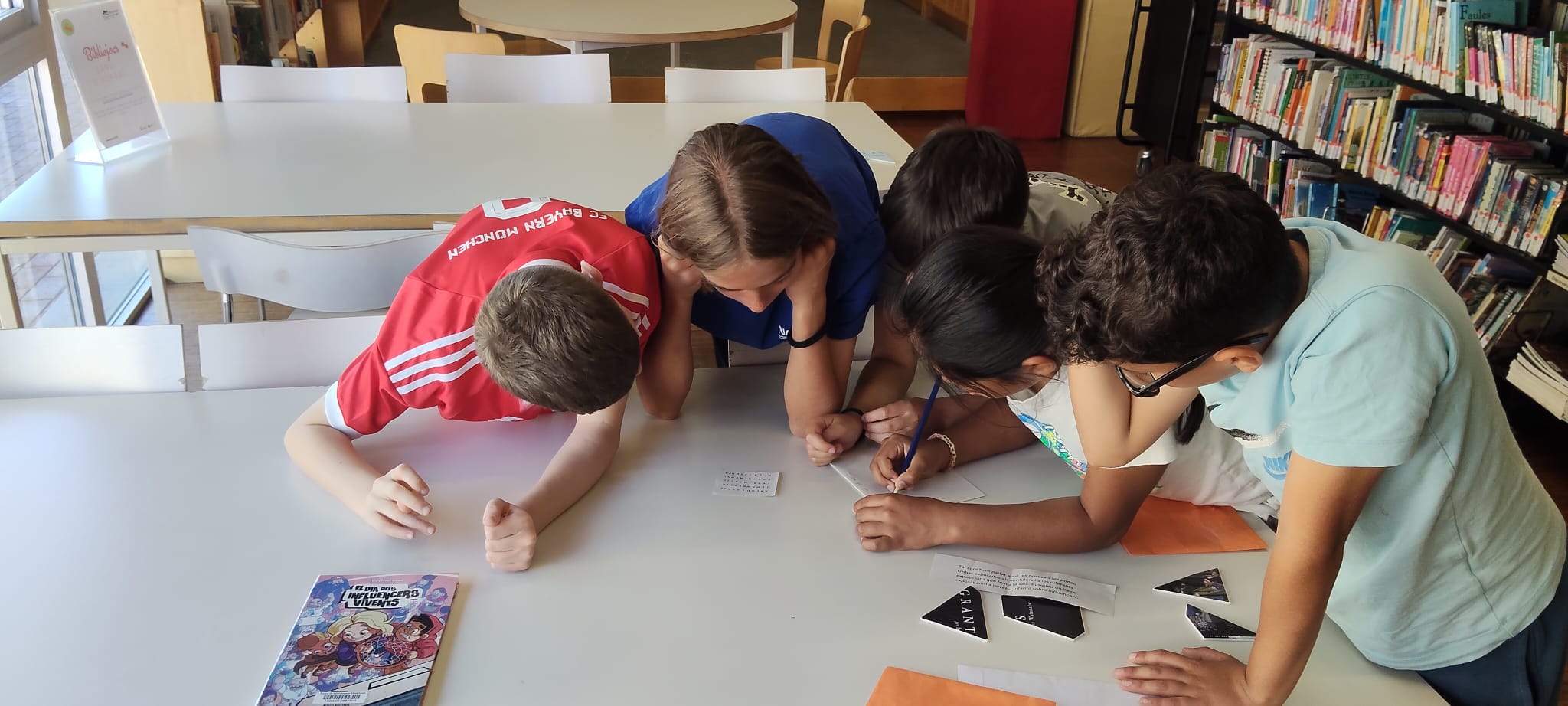 Aquesta setmana, les companyes i companys de 5è han visitat la biblioteca del municipi per conèixer de primera mà els seus espais, recursos i serveis. Ho han fet d’una manera ben dinàmica i engrescadora: participant en un joc de pistes en petit grup.