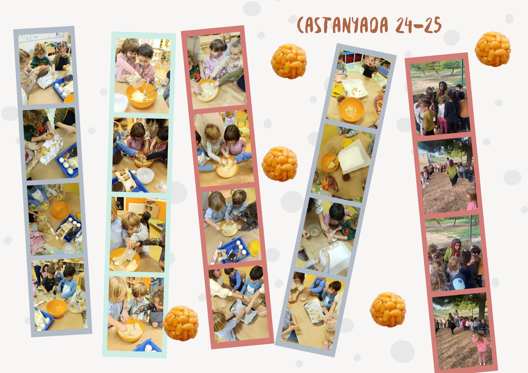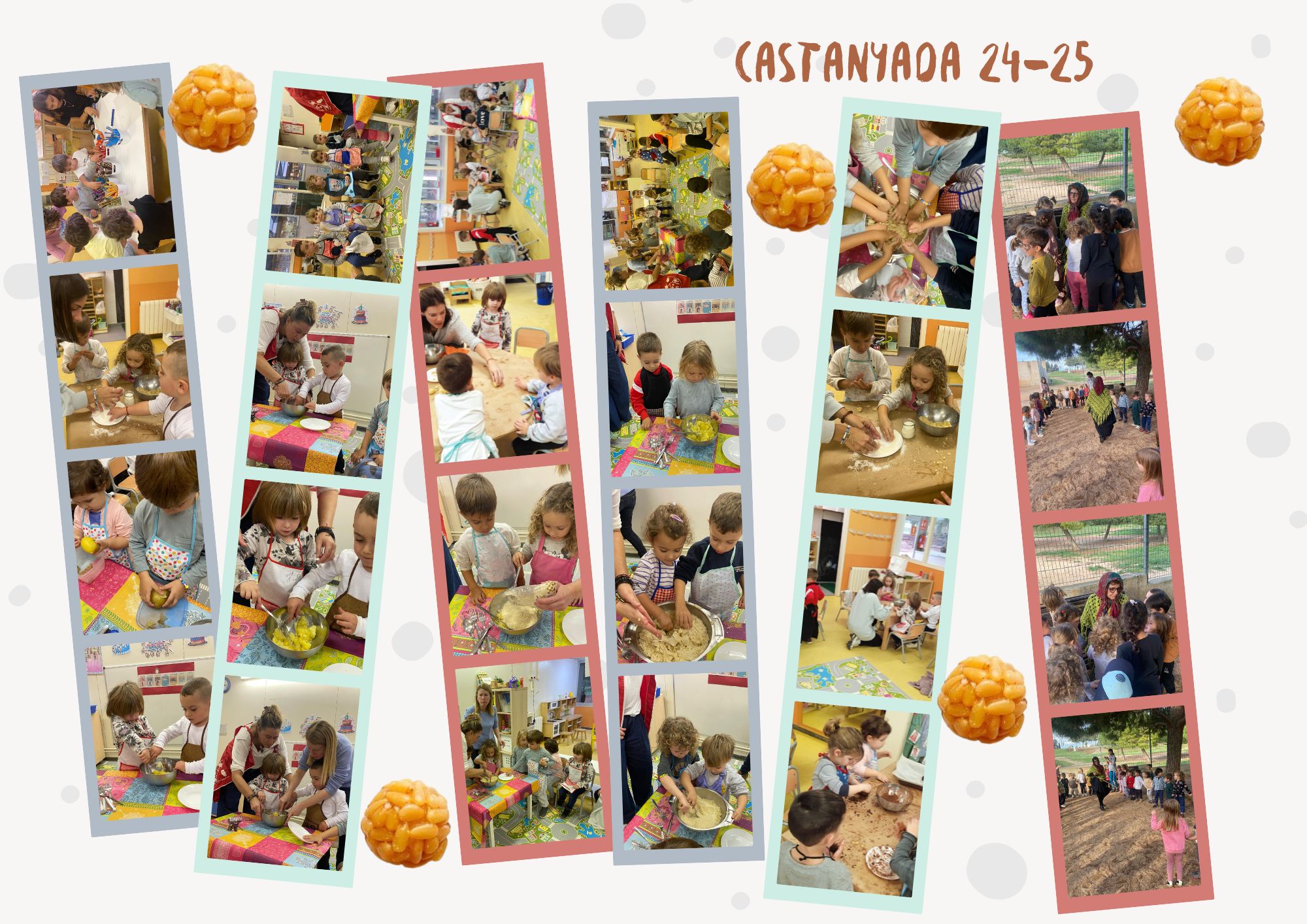 La Castanyera ha tornat a la nostra escola un any més. Pobreta! havia perdut les castanyes pel pati, però l’hem ajudat a trobar-les. Per celebrar-ho hem fet cançons i danses en una gran rotllana! També hem elaborat panellets amb ajuda de les famílies voluntàries. Estaven boníssims!