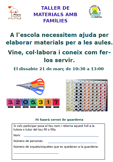 Taller de materials amb famílies. Feu un comentari / Per admin / 17 de març de 2015 / Informacions i notícies Pàgina principal Lo proper dissabte 21 de març de 10,30 a 13h esteu tothom convidat a participar del taller de famílies, on elaborarem diferents materials didàctics per a l’escola.