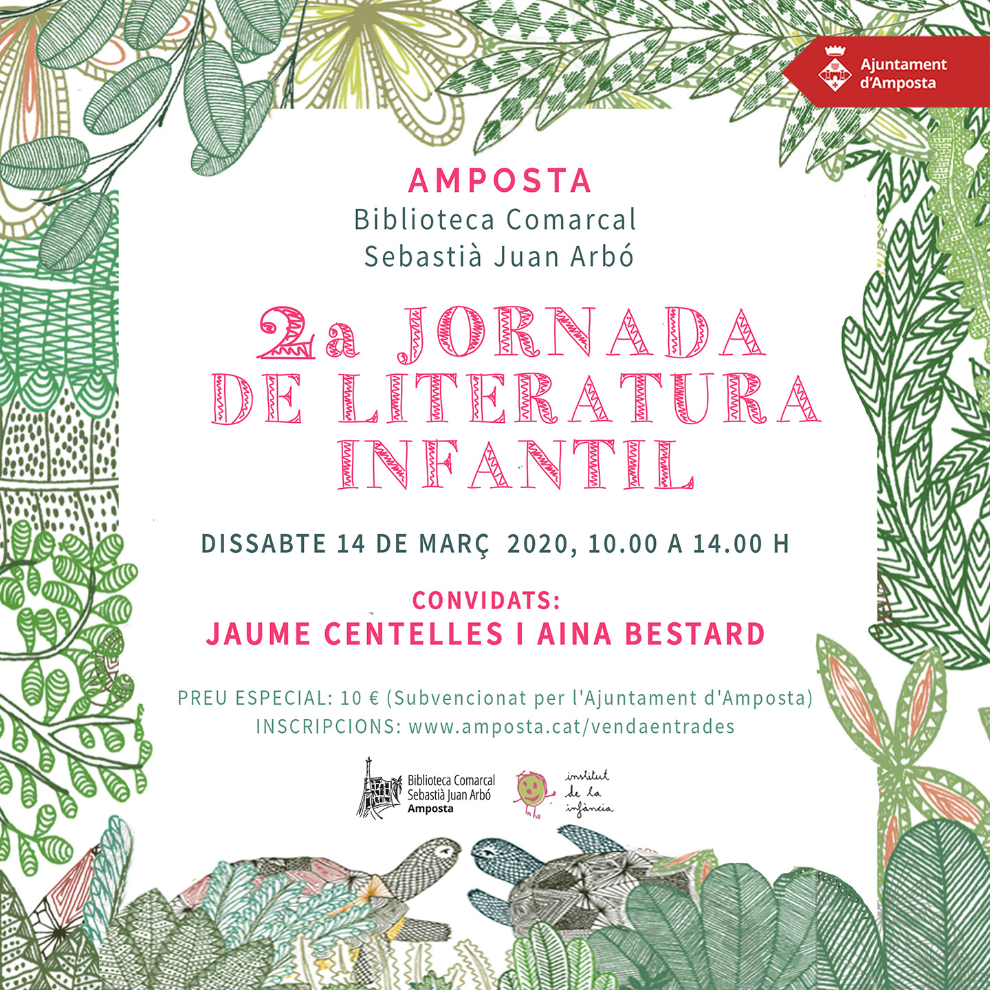 Us fem arribar el cartell i el programa de la 2a Jornada de Literatura Infantil que tindrà lloc el proper dissabte 14 de març en horari de 10 a 14 hores, amb tres convidats estrella: Jaume Centelles, tot un referent en literatura infantil, Núria Vouillamoz, coordinadora del CreaLIJ de l’Institut de la Infància i responsable de la biblioteca de l’escola Gerbert d’Orlhac de Sant Cugat del Vallès, i Aina Bestard, il·lustradora i dissenyadora, autora del magnífic àlbum Naixements bestials, que ens ha servit de referent per dissenyar el cartell de la Jornada.