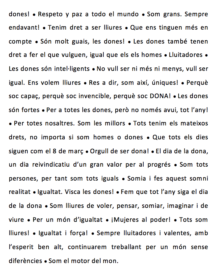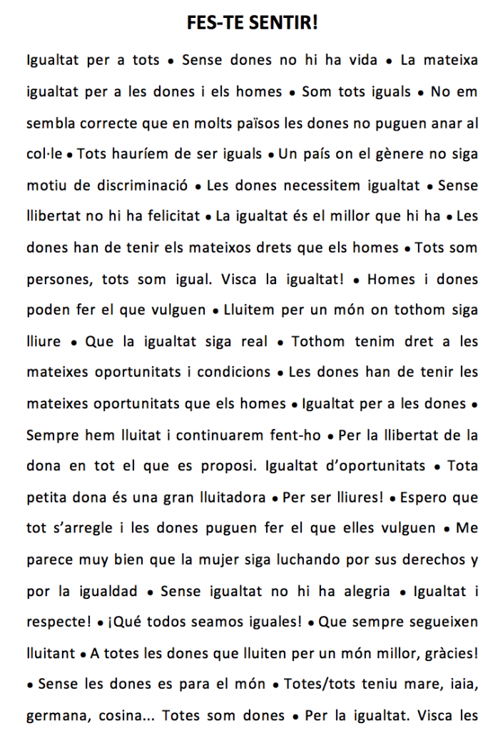 – Fer-nos sentir! S’han preparat tres carros mòbils (un per a cadascuna de les dues entrades al Centre i un tercer per al pati) a través dels quals s’ha animat a l’alumnat i a les famílies a expressar la seva opinió en relació a la igualtat de gènere i la celebració del 8 de març.