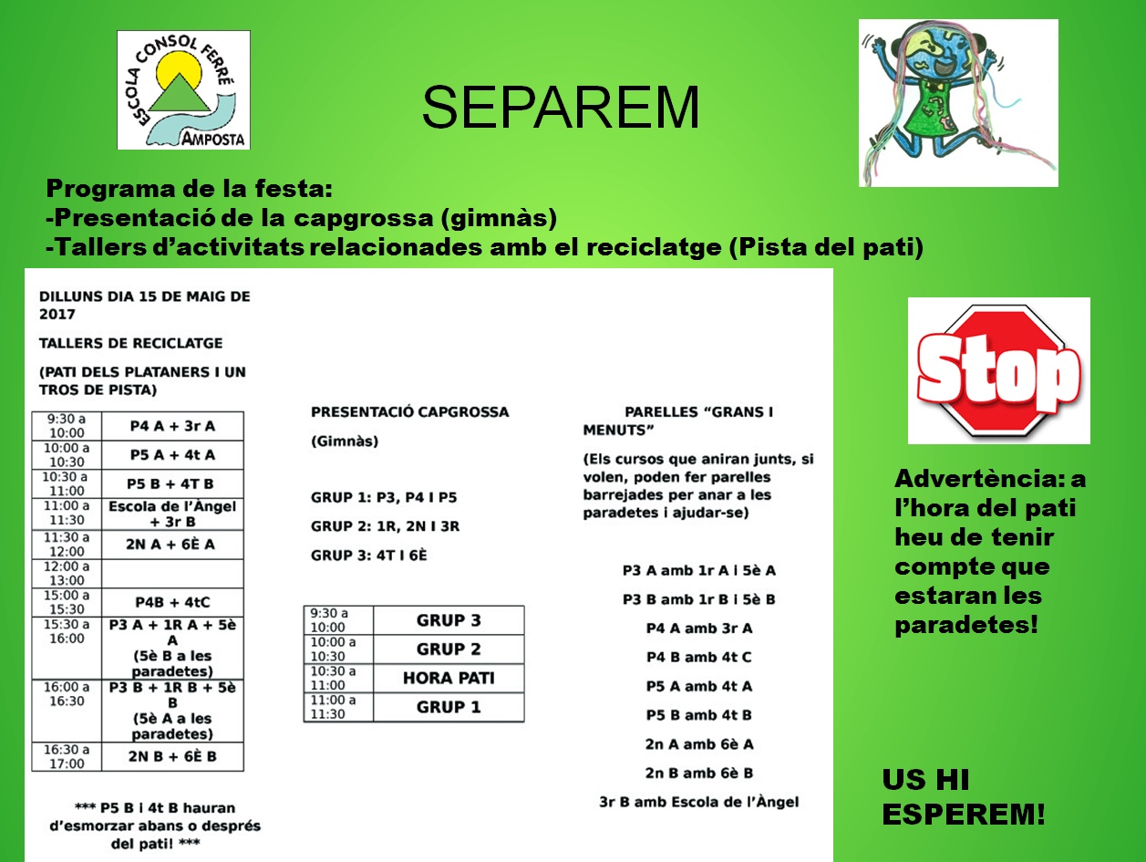 SEPAREM, REDUïM I REUTILITZEM Feu un comentari / Per admin / 11 de maig de 2017 / Pàgina principal Projectes Clica i escolta la cançó del RECICLATGE!!