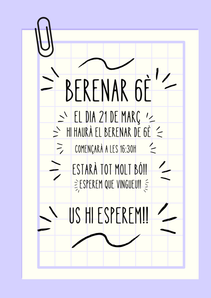 Esteu tots i totes convidades al berenar del proper dijous dia 21 de març. Ja sabeu que estem finançant la nostra sortida de fi de curs. A les 16:30h, davant de la nostra galeria!
