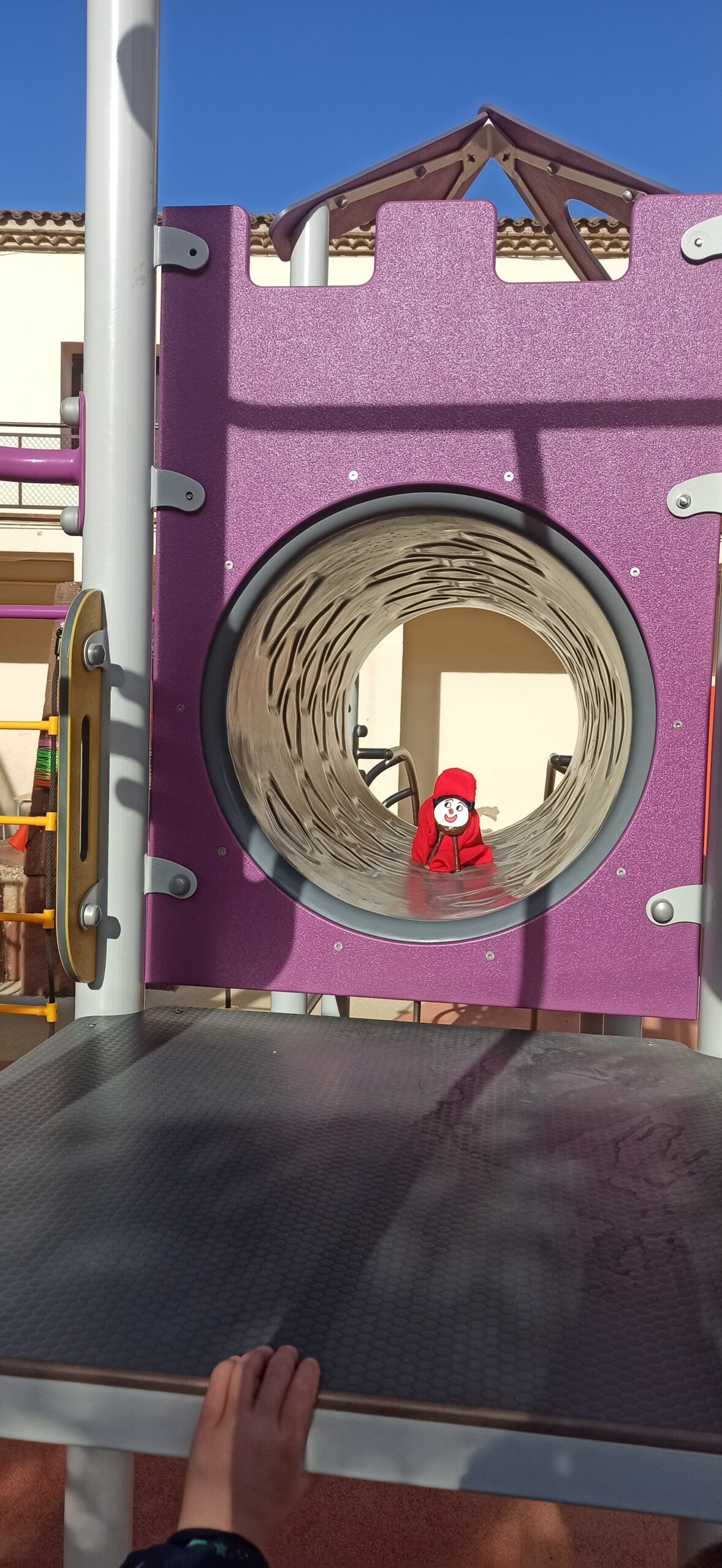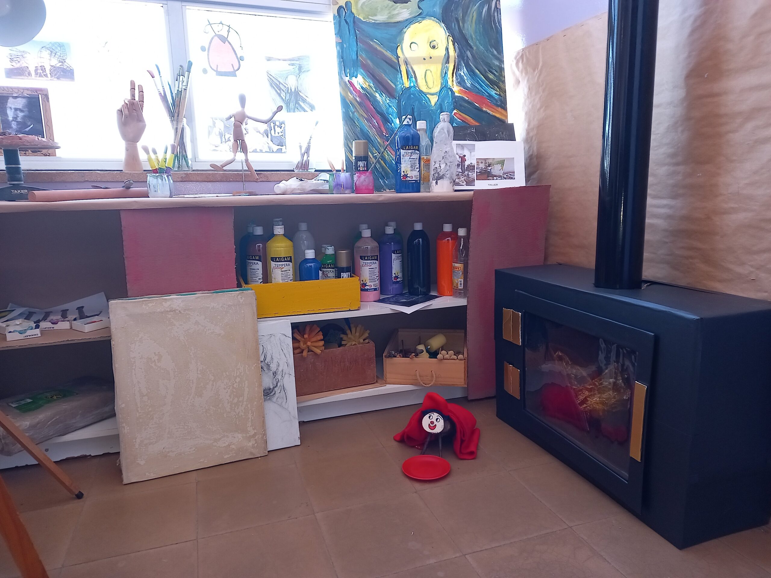 Ja tenim al passadís de p3, p4 i p5 el Tió. Aquest any ha arribat tot sol fins l’escola i com tenia fred es va amagar a l’estructura del pati fins que el vam trobar i el vam portar a un lloc més calent. Sort que li havíem preparat una estufa al taller dels artistes d’infantil. Allà li donarem de menjar fins que es faci gran i li puguem cantar la cançó i en cagui moltes sorpreses.