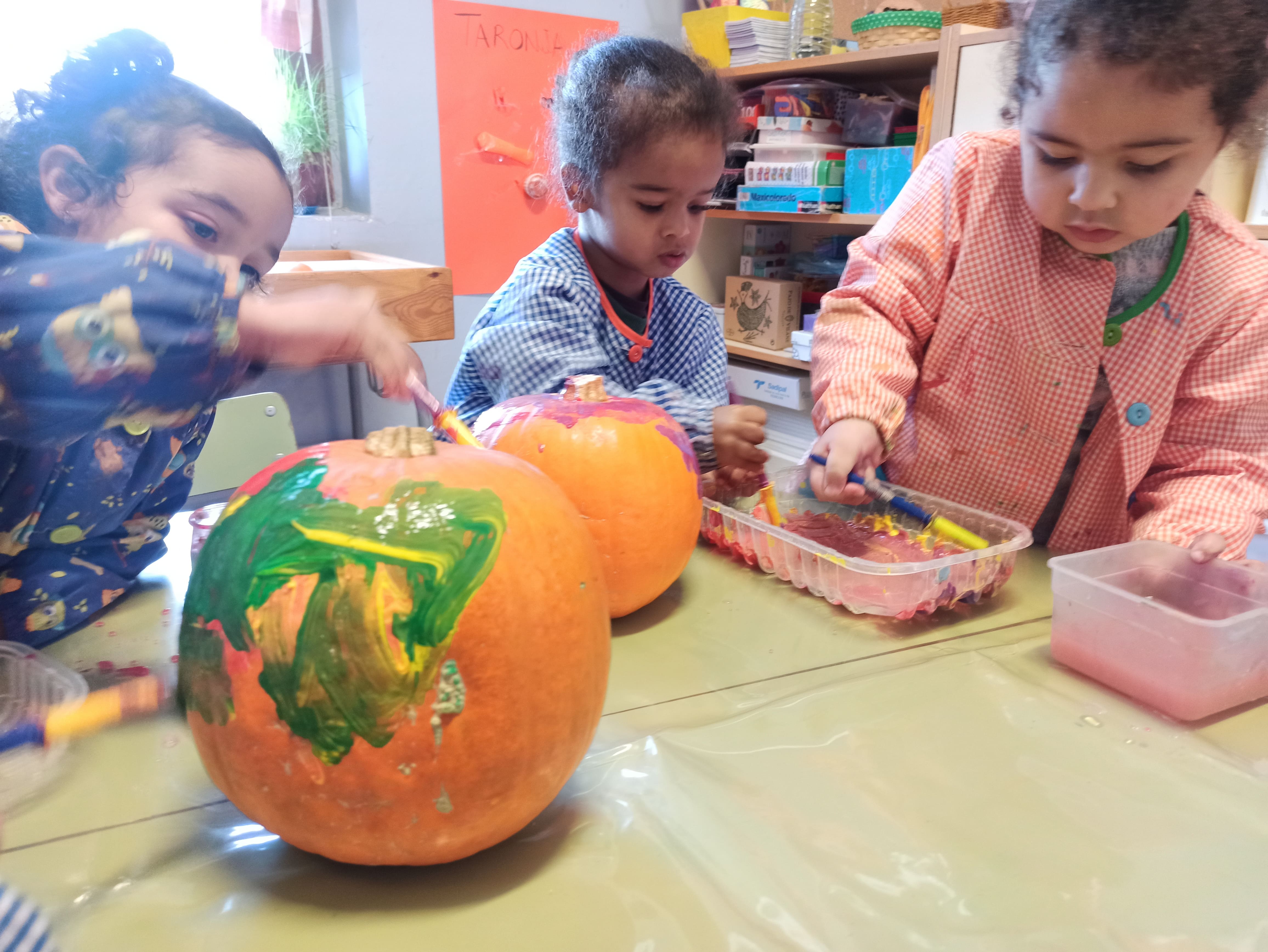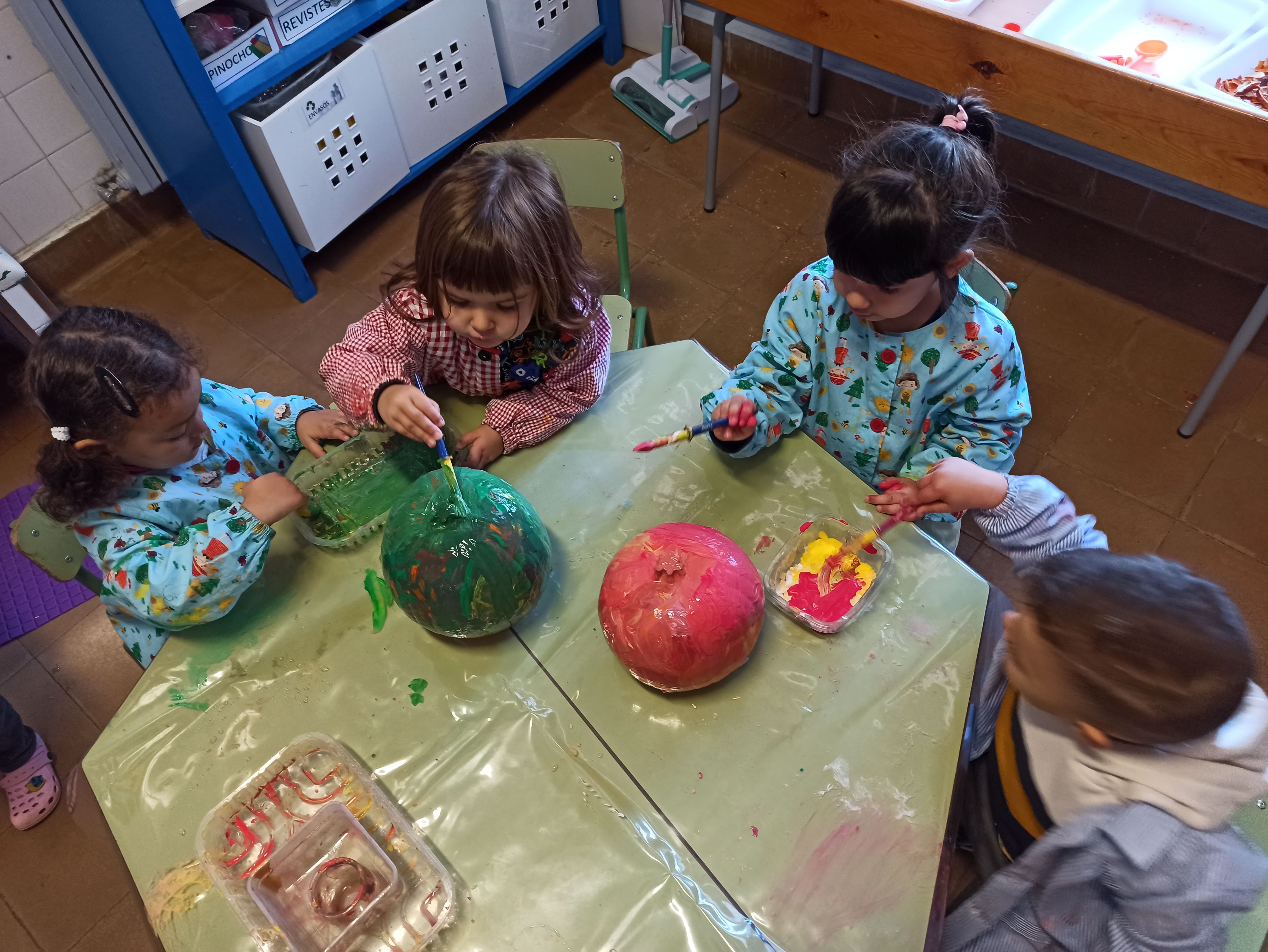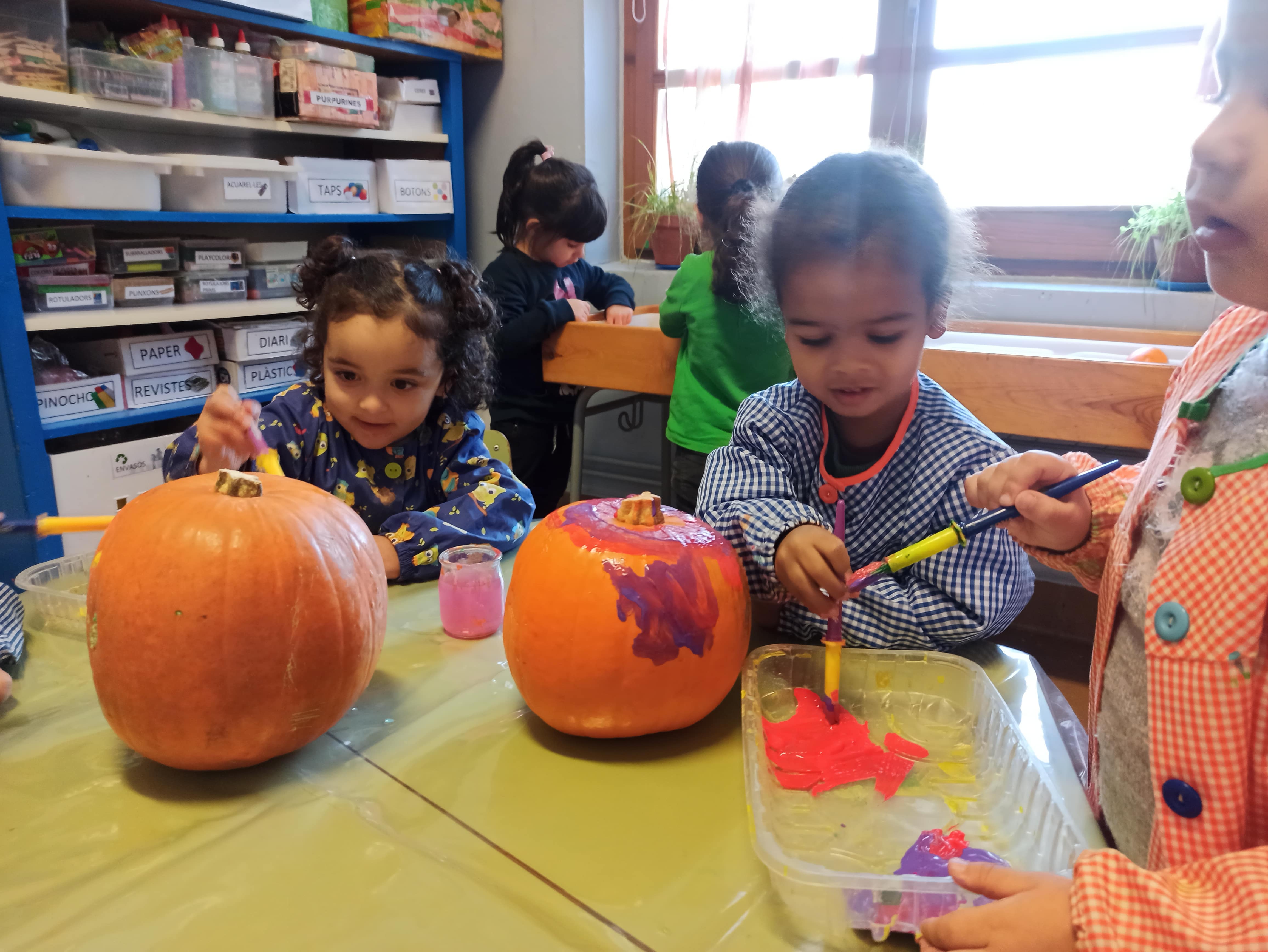 Durant aquesta setmana hem estat dibuixant Carbasses i se’ns ha ocorregut de pintar les carbasses taronges d’un altre color.