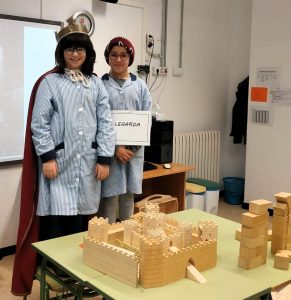 L’Assumpta, l’encarregada de fer-nos el taller, ens va repartir peces a cadascú per construir un castell. Després ens va dir: Tanqueu-vos els ulls. I ens va disfressar a tres de nosaltres sense que els altres ho veiéssim: la Sira, l’Iris i el Houdaifa. La Sira feia de compte, l’Iris de Legarda i el Houdaifa de Jofre.