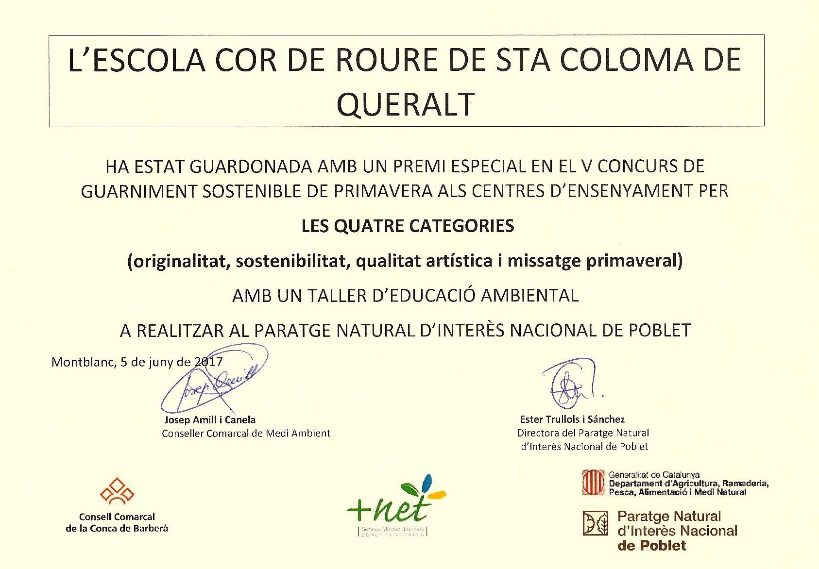 us fem saber que l’escola Cor de Roure ha obtingut un premi especial a les quatre categories a les quals es podia optar en el Concurs de guarniment sostenible de Primavera convocat pel Consell Comarcal de la Conca de Barberà.