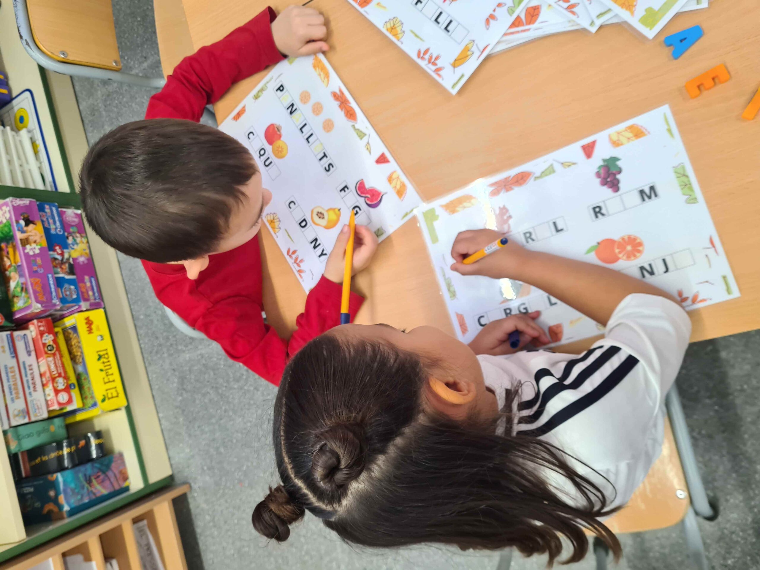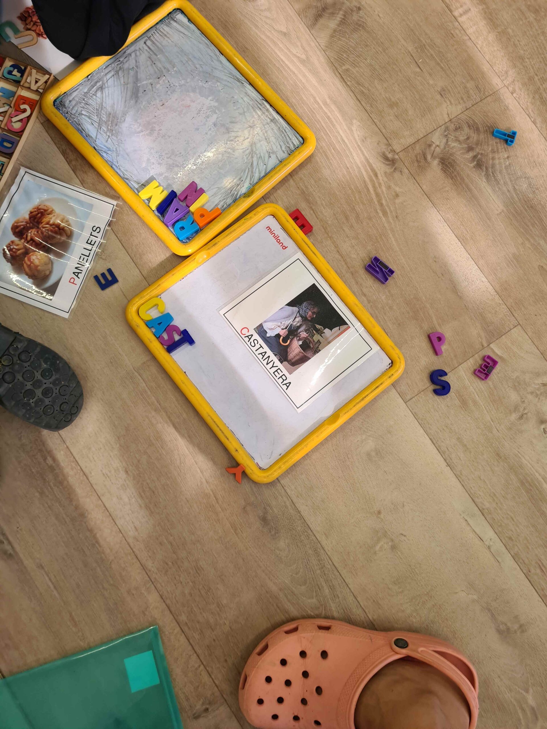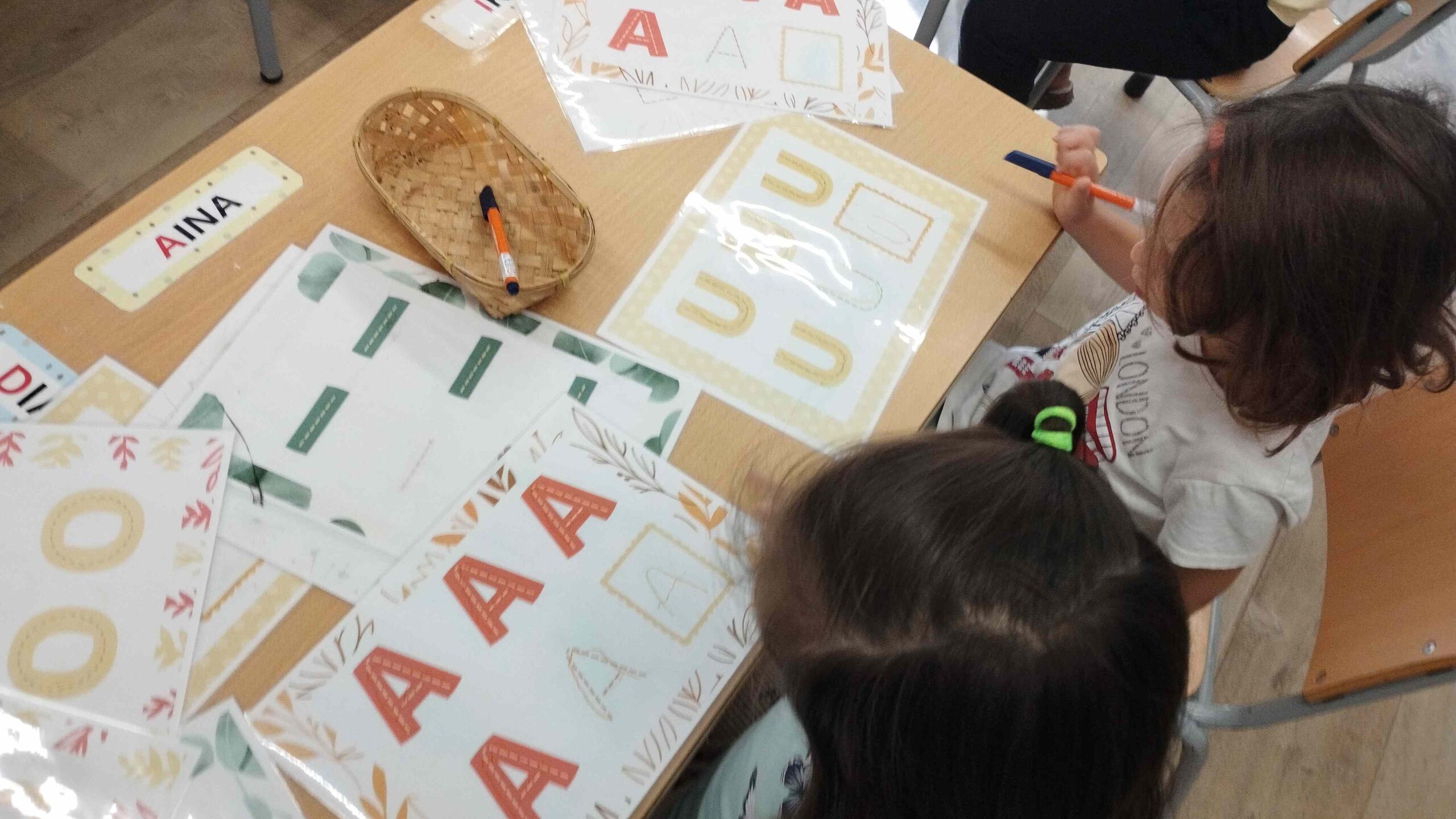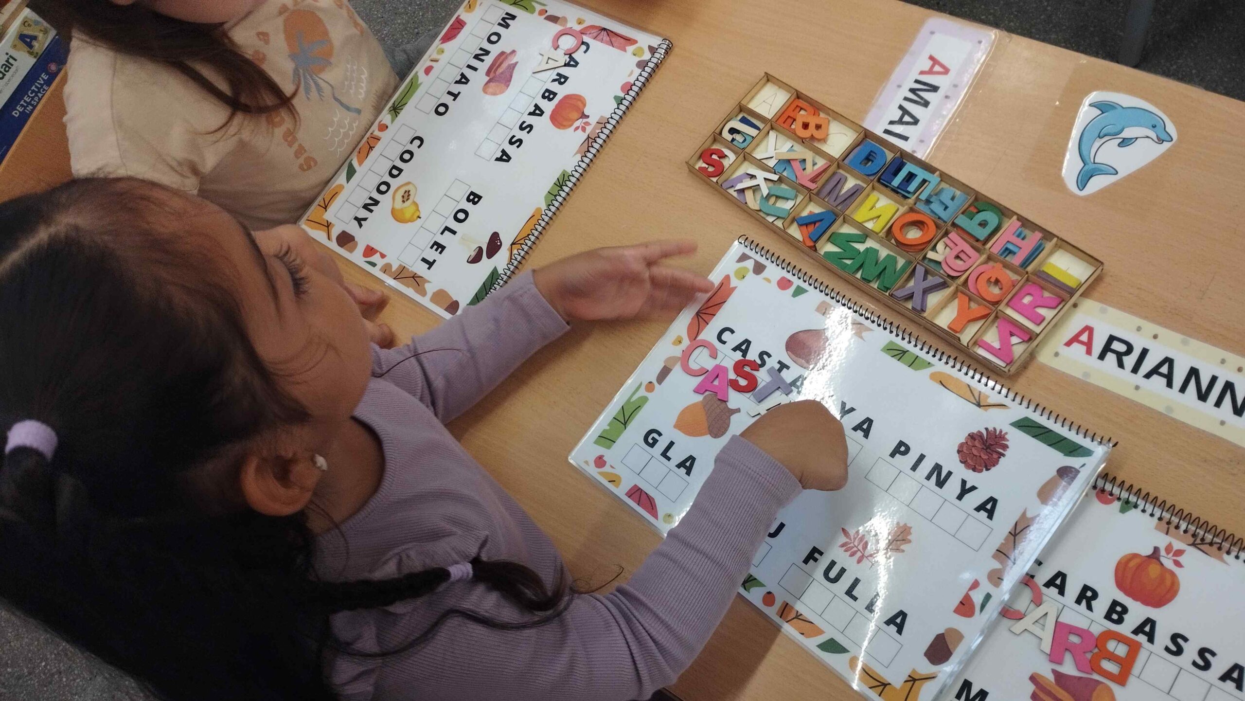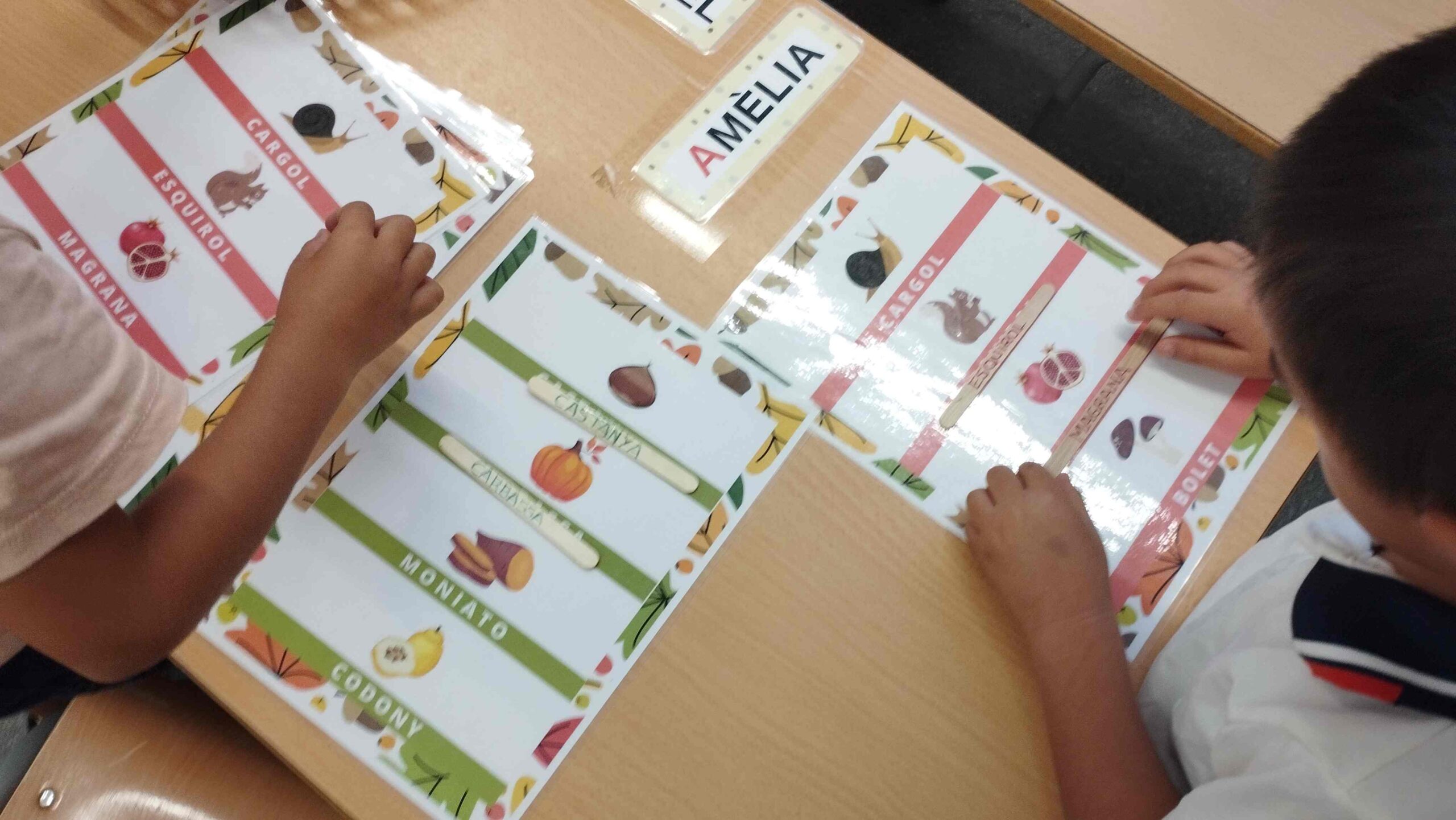 Els racons de lectoescriptura dels infants d’I4 i I5 ens permeten la possibilitat d’oferir propostes de treball als infants atenent la diversitat de cada alumne. Els materials preparats estan relacionats amb l’estació de l’any en què ens trobem i estan seqüenciats per nivell de dificultat. Els infants en grups de treball heterogenis, però també de forma autònoma, van jugant amb les lletres, les paraules i aprenen conceptes de consciència fonològica, discriminació auditiva, rimes, consciència de frases, ordenació de frases…