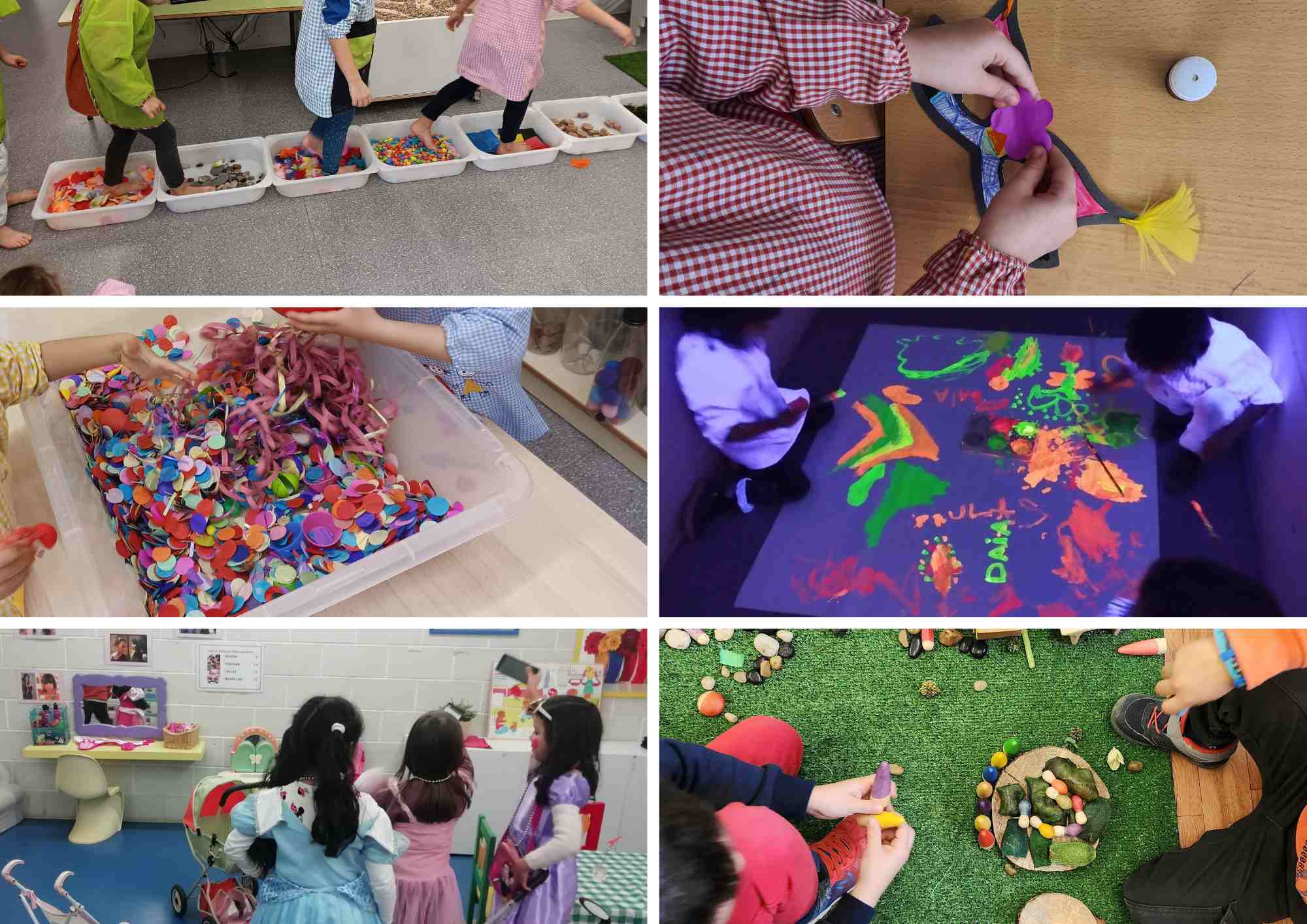 Alguns ambients d’aquestes setmanes han estat inspirats en aquesta festa, per exemple, a l’artístic hem fet màscares, al de llum i ombres hem pogut pintar amb pintura fluorescent i hem trobat les taules de llum folrades de colors, al de moviment hem jugat amb les emocions i hem ballat el tren de l’alegria, al de joc simbòlic ens hem pogut disfressar i maquillar…