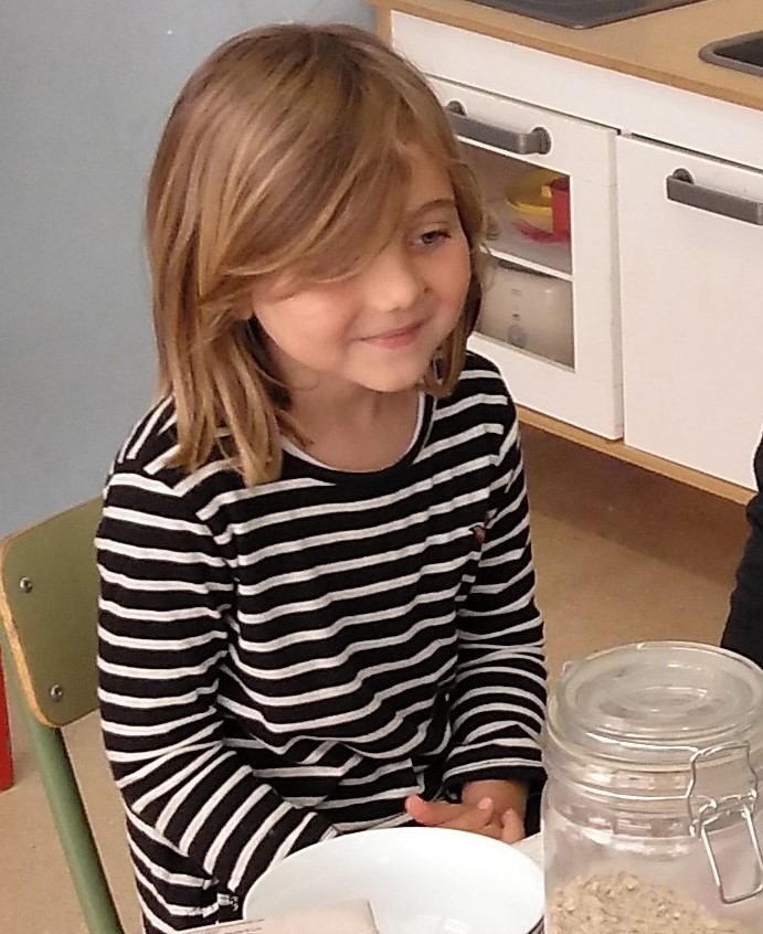 Què esmorzeu abans de venir a l’escola? L’Ona Baixes va voler compartir amb tots nosaltres una recepta del seu esmorzar preferit. Llet de civada, amb flocs de civada, trossos de poma, panses, nous, i alguna cosa més… La seva mare que va venir a ajudar l’Ona el dia del protagonista, ens va dir que si prepares el muesli la nit abans de menjar-ho i ho deixes a la nevera està encara més bo.