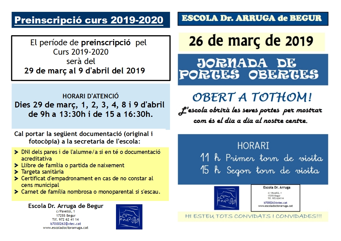 PREINSCRIPCIÓ CURS 2019-2020 I JORNADA DE PORTES OBERTES Feu un comentari / Per admin / 14 de març de 2019 / General Portada Adjuntem la informació de les dades referents a la Preinscripció curs 2019-2020 i la Jornada de Portes Obertes.