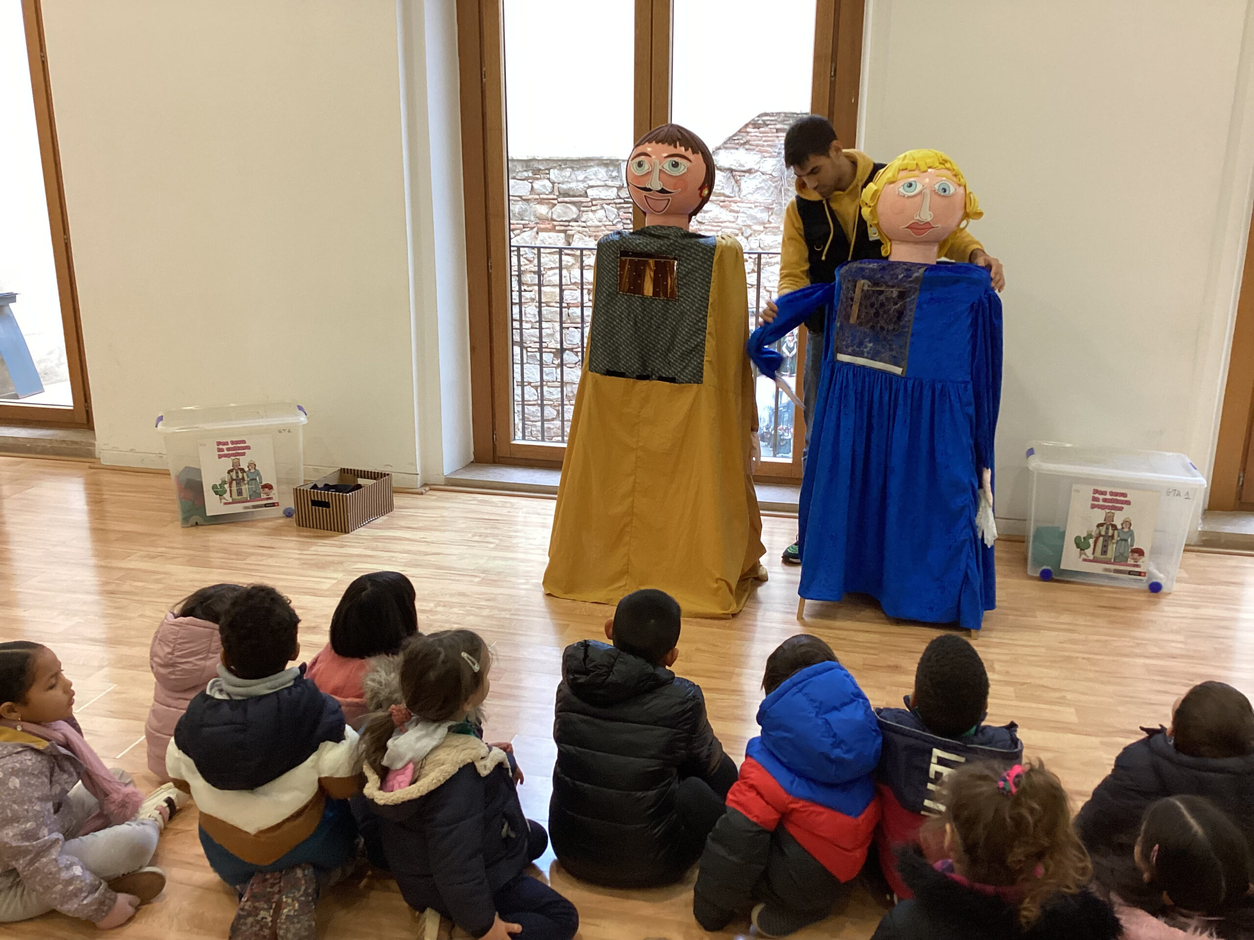 Per acabar la nostra visita a “La casa dels entremesos”, vam pujar a una sala i vam poder anar construint un gegant i una gegantona amb tots els seus complements: els vestits, cinturons, espases, els diferents caps amb els ulls, la boca i el nas. I finalment, vam poder entrar dins de l’estructura dels gegants i poder alçar-lo.