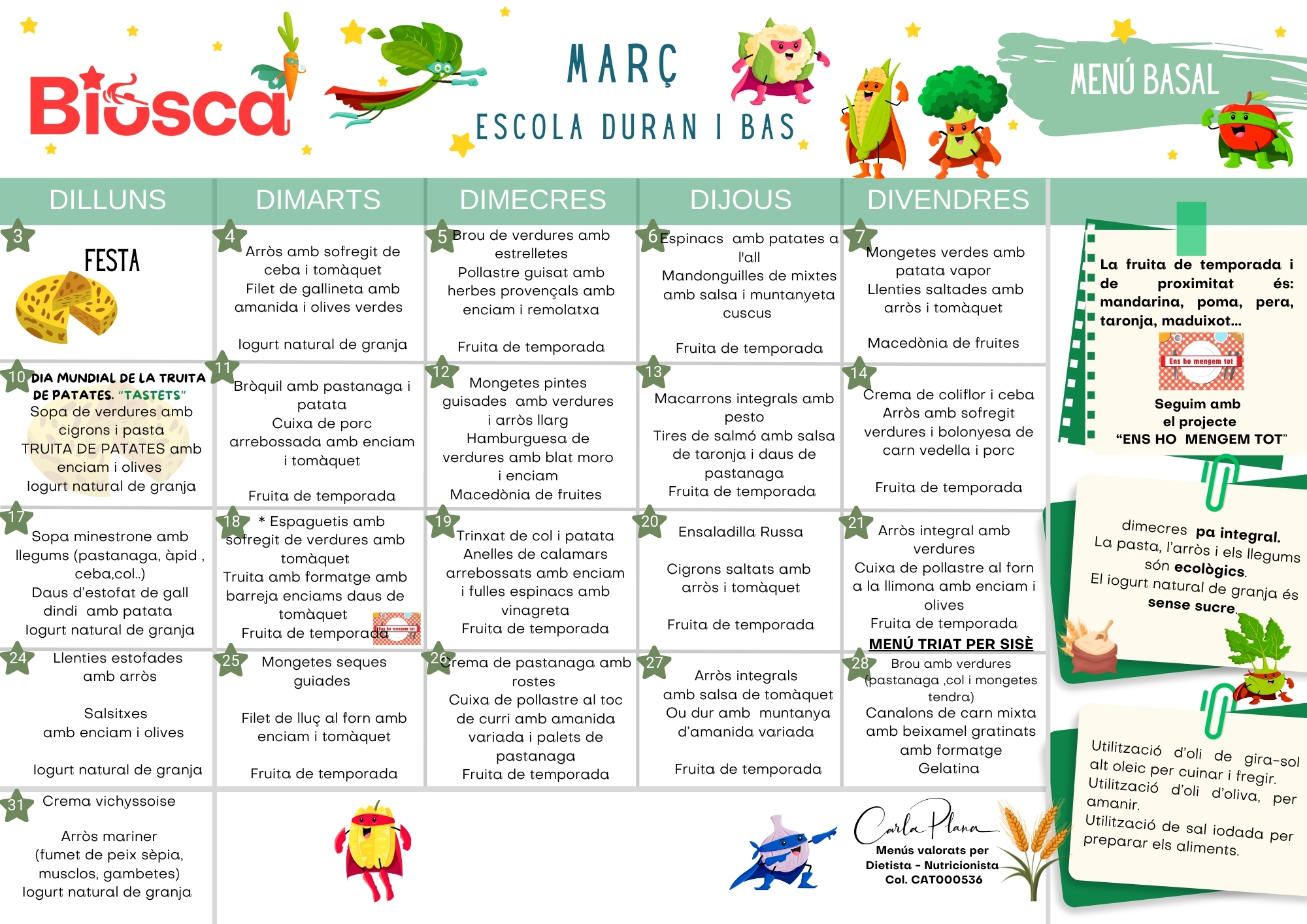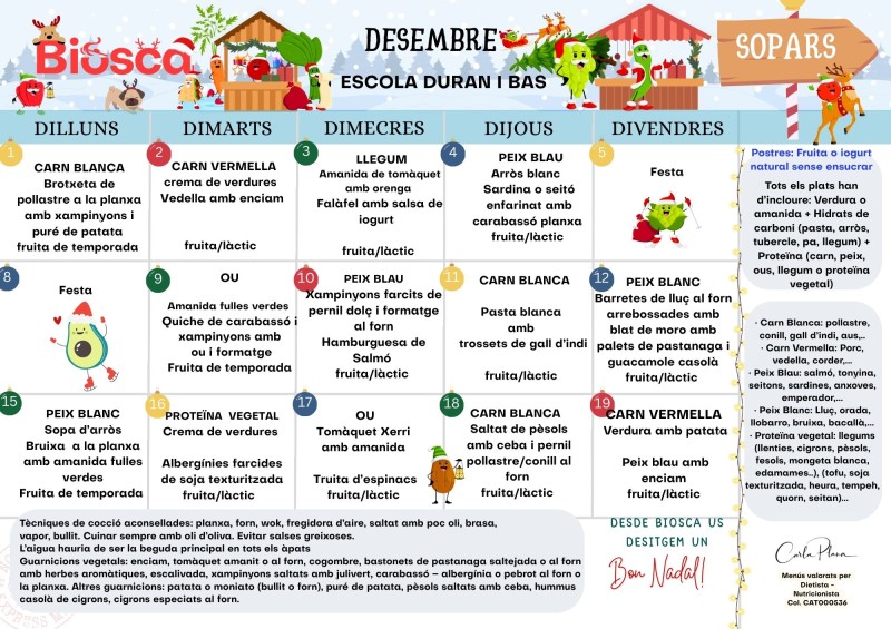 Menú escolar Podeu consultar els diferents menús de l’escola d’aquest curs: Maig 2025 sopars Abril 2025 Març 2025 Febrer 2026 Gener 2026 Desembre 2025 Novembre 2024 Octubre 2024 Setembre 2024 Menú Basal Menú sense fruits secs Resum de les activitats de migdia