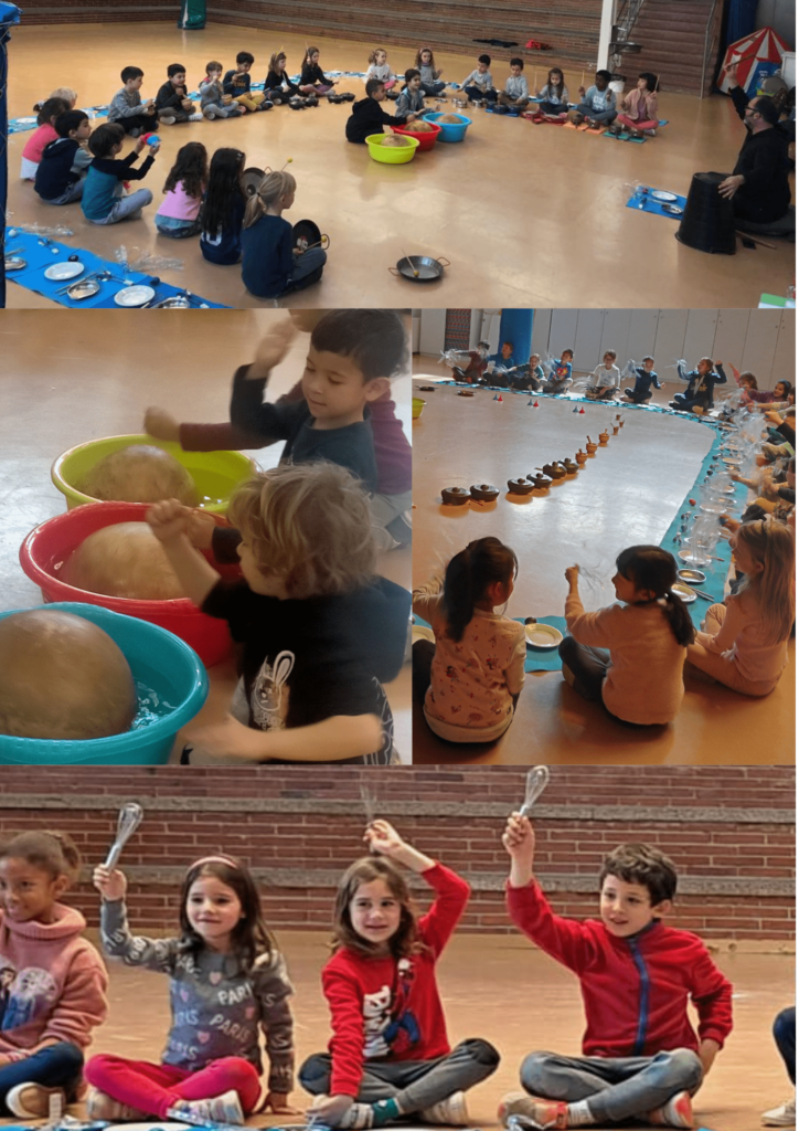 Els nens i nenes dels cursos I5 i 1r han participat en el taller musical “La cuina dels ritmes”, que s’ha dut a terme per part de la factoria artística KHAN CARTRÖ a l’escola. Els estris de cuina habituals com olles, cassoles, paelles, morters, culleres, cullerots, “palillos” xinesos, batedors, bols, garrafes, ampolles de plàstic… s’han convertit en instruments per fer ritmes de percussió.