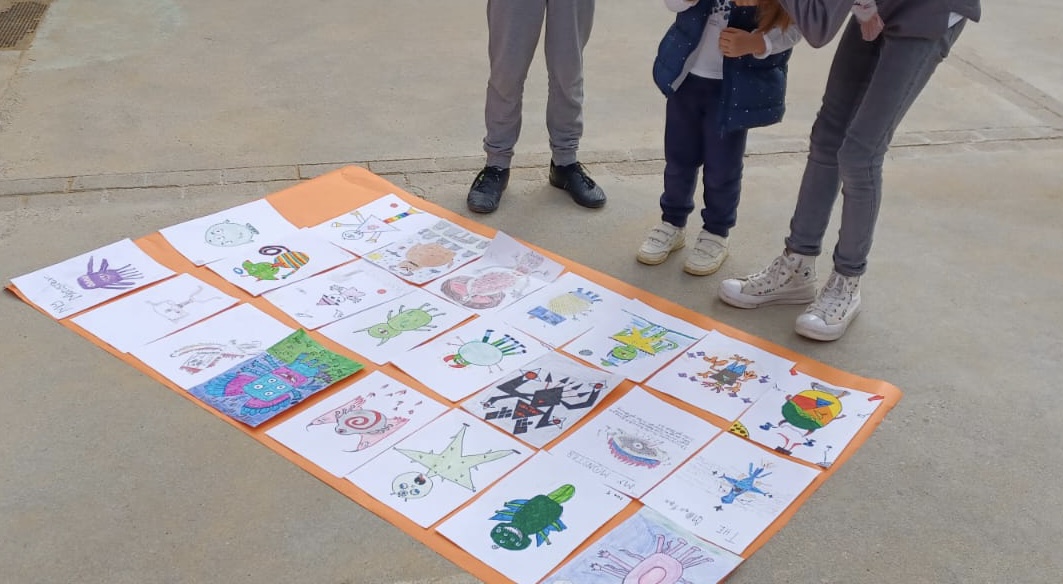 L’alumnat de 5è de primària ha visitat a l’alumnat d’I4 i d’I5 per presentar-los els monstres que han creat els grans. Ens hem reunit al pati i per parelles de diferent nivell ens hem preguntat, en anglès, pel nom.