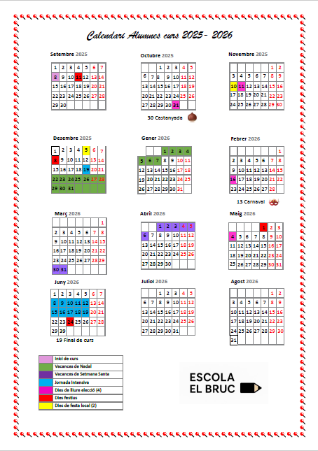 L’horari lectiu del centre és de 8,30h a 12,30 h i de 14,30 a 16,30 h per a tot l’alumnat de primària i de 9,00h a 12,30h i de 15,00h a 16,30h per tot l’alumnat d’infantil. A partir del 8 de juny de 2026 es realitza horari compactat de 8,30 a 13h a primària i de 9,00 a 13h a infantil. (Els alumnes que utilitzen el servei de menjador sortiran a les 15:00h.)