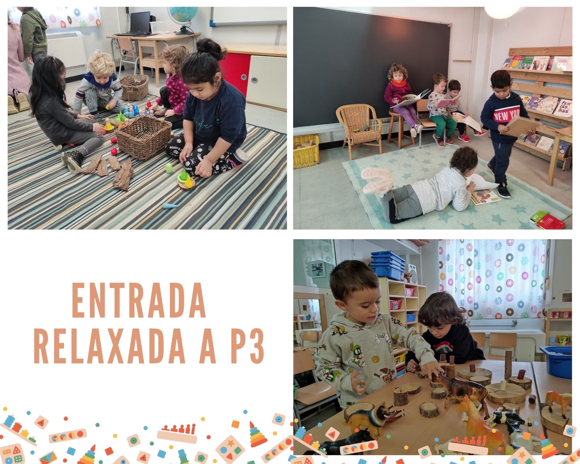 El dia a l’aula de P3 comença amb l’entrada relaxada, un moment molt important dins el dia a dia a l’escola. De les 9 a les 9.30h els infants tenen al seu abast diferents propostes de joc a realitzar mentre van arribant tots els nens i nenes: propostes de joc simbòlic (cuineta, granja, trens,…) de motricitat fina, mirar contes a la biblioteca, fer trencaclosques… És una estona on vetllem per respectar la individualitat i el ritme de cada infant. També és un moment del dia que afavoreix la relació entre iguals, ja que tenen l’oportunitat de compartir converses espontànies i jocs plegats. Passada aquesta estona de l’entrada relaxada, arriba el moment de recollir les joguines i els materials que han fet servir. Quan queda tot recollit, els infants van a l’espai de l’assemblea per iniciar el bon dia